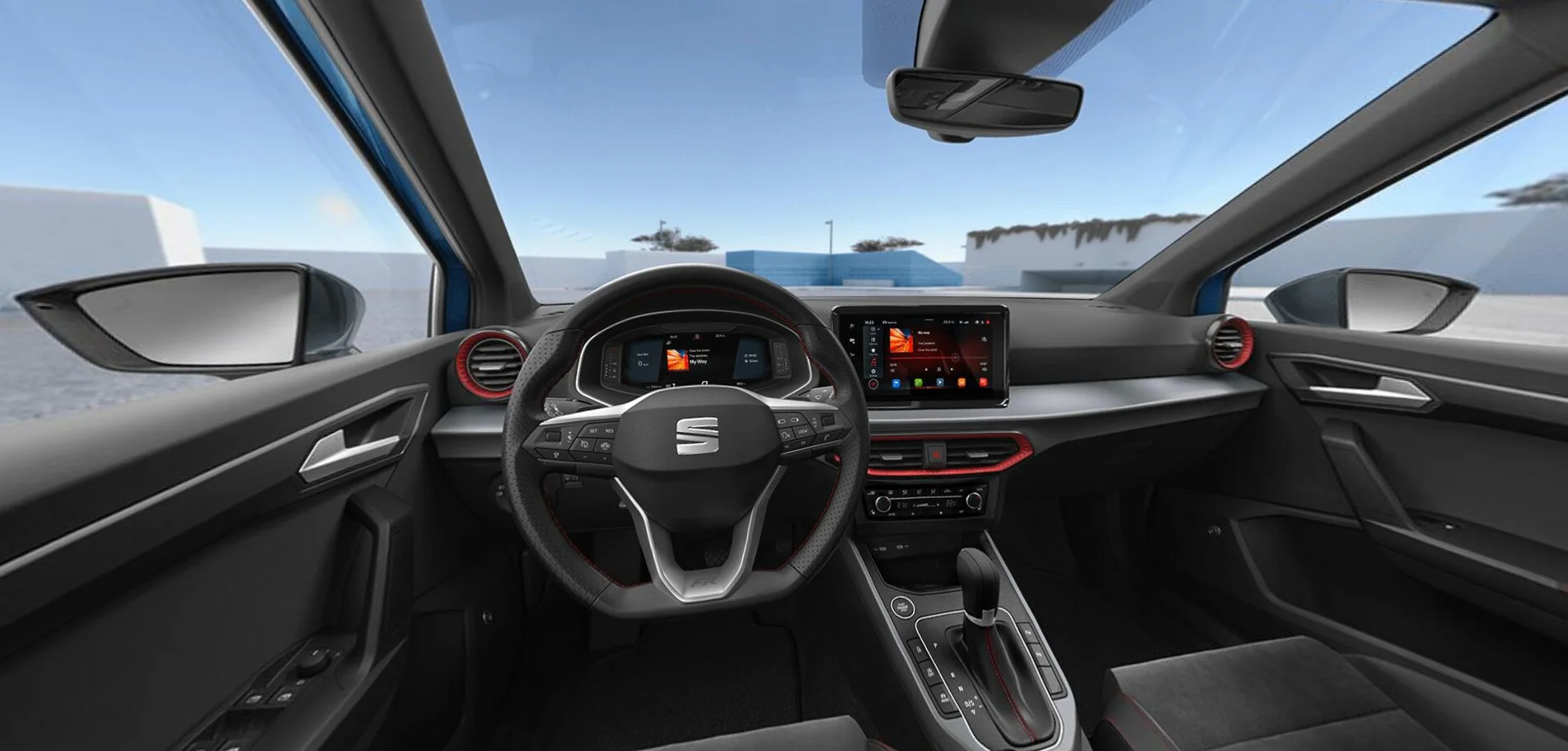 Wnętrze SEAT Arona FR zostało zaprojektowane z myślą o najwyższym komforcie i funkcjonalności. Kabina oferuje wysokiej jakości materiały, ergonomiczne sportowe fotele wykończone Alcantarą oraz przemyślane rozwiązania, które zapewniają wygodę zarówno kierowcy, jak i pasażerom. Nowoczesny system multimedialny z dużym ekranem dotykowym, nawigacją oraz integracją smartfona poprzez Apple CarPlay i Android Auto zapewnia łatwy dostęp do wszystkich funkcji pojazdu. Cyfrowy kokpit SEAT Digital Cockpit oferuje intuicyjny dostęp do informacji o pojeździe, zwiększając komfort i bezpieczeństwo jazdy.