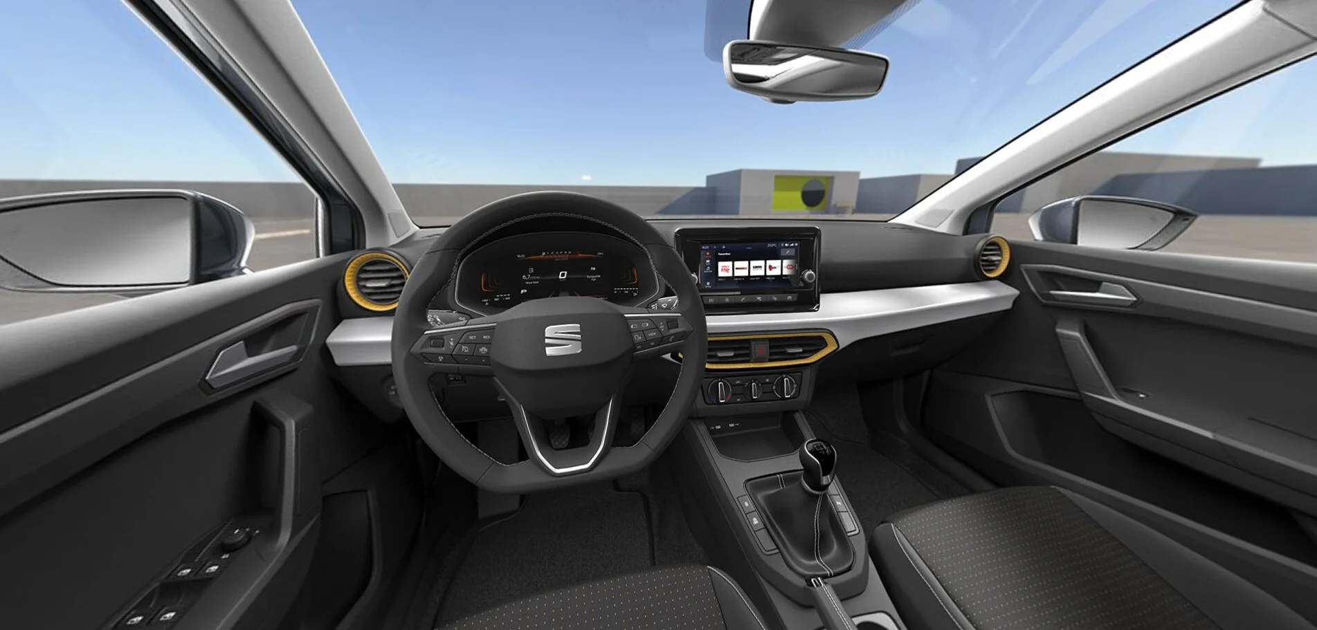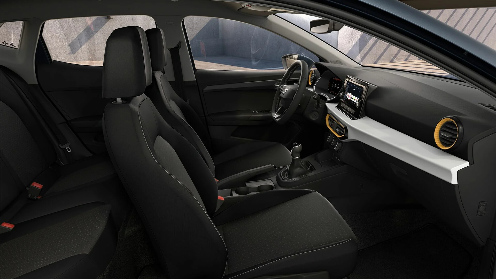 Wnętrze Seat Ibiza zostało zaprojektowane z myślą o komforcie i funkcjonalności. Przestronna kabina oferuje wysokiej jakości materiały, ergonomiczne fotele oraz nowoczesny system multimedialny z ekranem dotykowym, nawigacją i integracją smartfona przez Apple CarPlay i Android Auto. Cyfrowy kokpit oferuje intuicyjny dostęp do informacji o pojeździe, zwiększając komfort i bezpieczeństwo jazdy.
