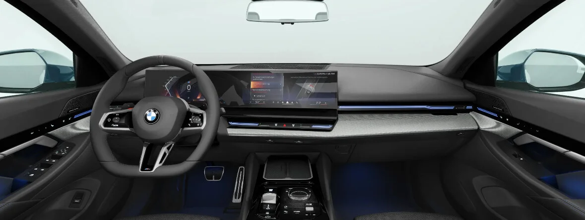 Wnętrze BMW 540d Touring zostało zaprojektowane z myślą o najwyższym komforcie i funkcjonalności. Przestronna kabina oferuje najwyższej jakości materiały, ergonomiczne fotele wykończone skórą oraz przemyślane rozwiązania, które zapewniają wygodę zarówno kierowcy, jak i pasażerom. Nowoczesny system multimedialny iDrive 8 z dużym ekranem dotykowym, nawigacją oraz integracją smartfona poprzez Apple CarPlay i Android Auto zapewnia łatwy dostęp do wszystkich funkcji pojazdu. Cyfrowy kokpit BMW Live Cockpit Professional oferuje intuicyjny dostęp do informacji o pojeździe, zwiększając komfort i bezpieczeństwo jazdy.