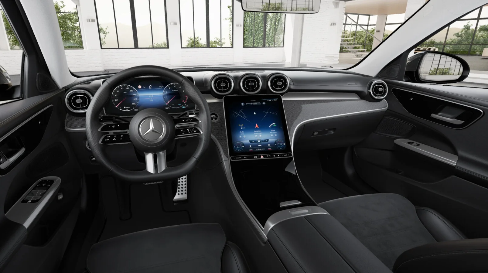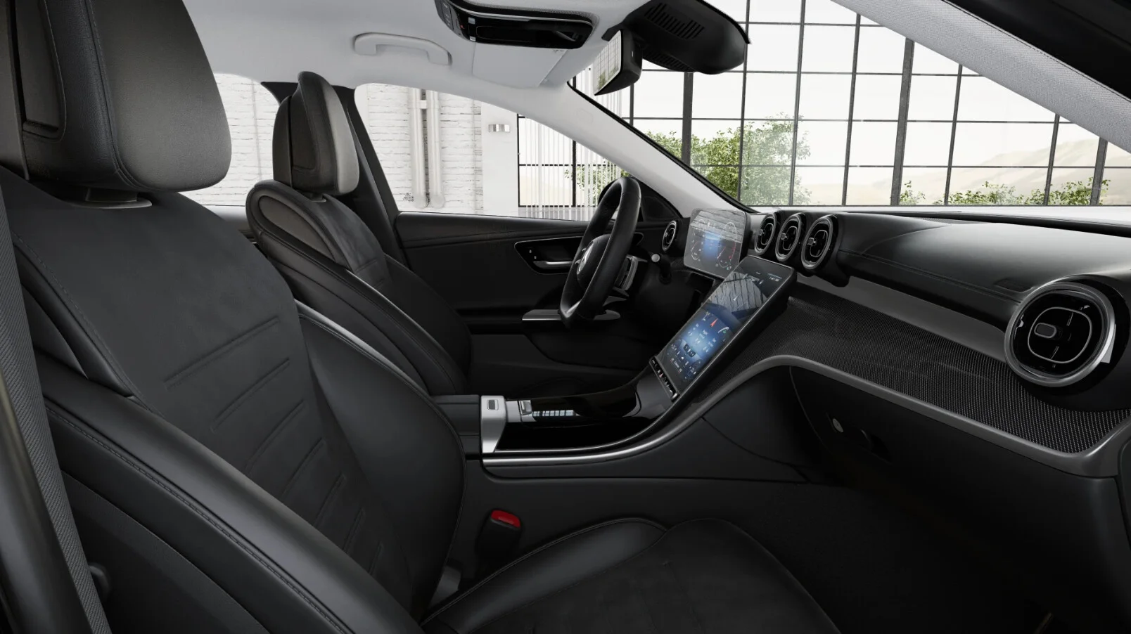 Wnętrze Mercedes-Benz C 180 AMG Advanced zostało zaprojektowane z myślą o najwyższym komforcie i sportowym charakterze. Przestronna kabina oferuje najwyższej jakości materiały, takie jak skóra ARTICO i mikrofibra DINAMICA, oraz ergonomiczne sportowe fotele z przeszyciami AMG, które zapewniają wygodę zarówno kierowcy, jak i pasażerom. Nowoczesny system multimedialny MBUX z dużym ekranem dotykowym, nawigacją oraz integracją smartfona poprzez Apple CarPlay i Android Auto zapewnia łatwy dostęp do wszystkich funkcji pojazdu. Cyfrowy kokpit Mercedes-Benz z interfejsem AMG oferuje intuicyjny dostęp do informacji o pojeździe, zwiększając komfort i bezpieczeństwo jazdy.