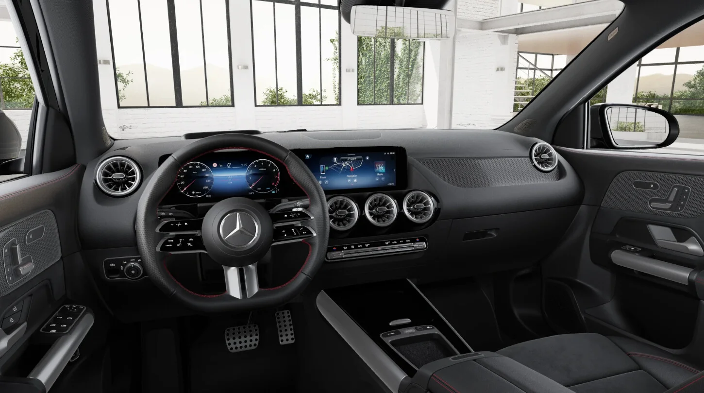 Wnętrze Mercedes-Benz GLA 200 AMG Premium Plus zaprojektowano z myślą o najwyższym komforcie i nowoczesności. Przestronna kabina oferuje najwyższej jakości materiały, takie jak skóra ARTICO, oraz ergonomiczne sportowe fotele z przeszyciami AMG, które zapewniają wygodę zarówno kierowcy, jak i pasażerom. Nowoczesny system multimedialny MBUX z dwoma dużymi ekranami, nawigacją oraz integracją smartfona poprzez Apple CarPlay i Android Auto, zapewnia łatwy dostęp do wszystkich funkcji pojazdu. Cyfrowy kokpit Mercedes-Benz z interfejsem AMG oferuje intuicyjny dostęp do informacji o pojeździe, zwiększając komfort i bezpieczeństwo jazdy.