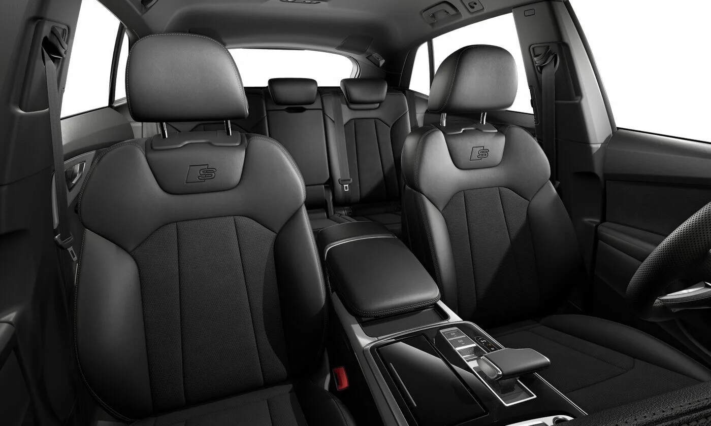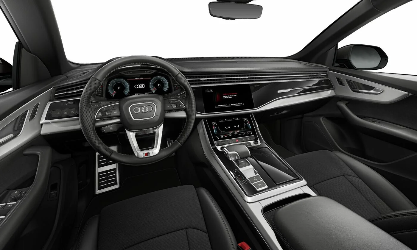 Wnętrze Audi Q8 55 TFSI quattro zostało zaprojektowane z myślą o najwyższym komforcie i nowoczesności. Przestronna kabina oferuje najwyższej jakości materiały, takie jak skóra Valcona i aluminium, oraz ergonomiczne fotele z elektryczną regulacją i funkcją podgrzewania, które zapewniają wygodę zarówno kierowcy, jak i pasażerom. Nowoczesny system multimedialny MMI Navigation Plus z dwoma dużymi ekranami dotykowymi, nawigacją oraz integracją smartfona poprzez Apple CarPlay i Android Auto, zapewnia łatwy dostęp do wszystkich funkcji pojazdu. Cyfrowy kokpit Audi Virtual Cockpit Plus oferuje intuicyjny dostęp do informacji o pojeździe, zwiększając komfort i bezpieczeństwo jazdy.