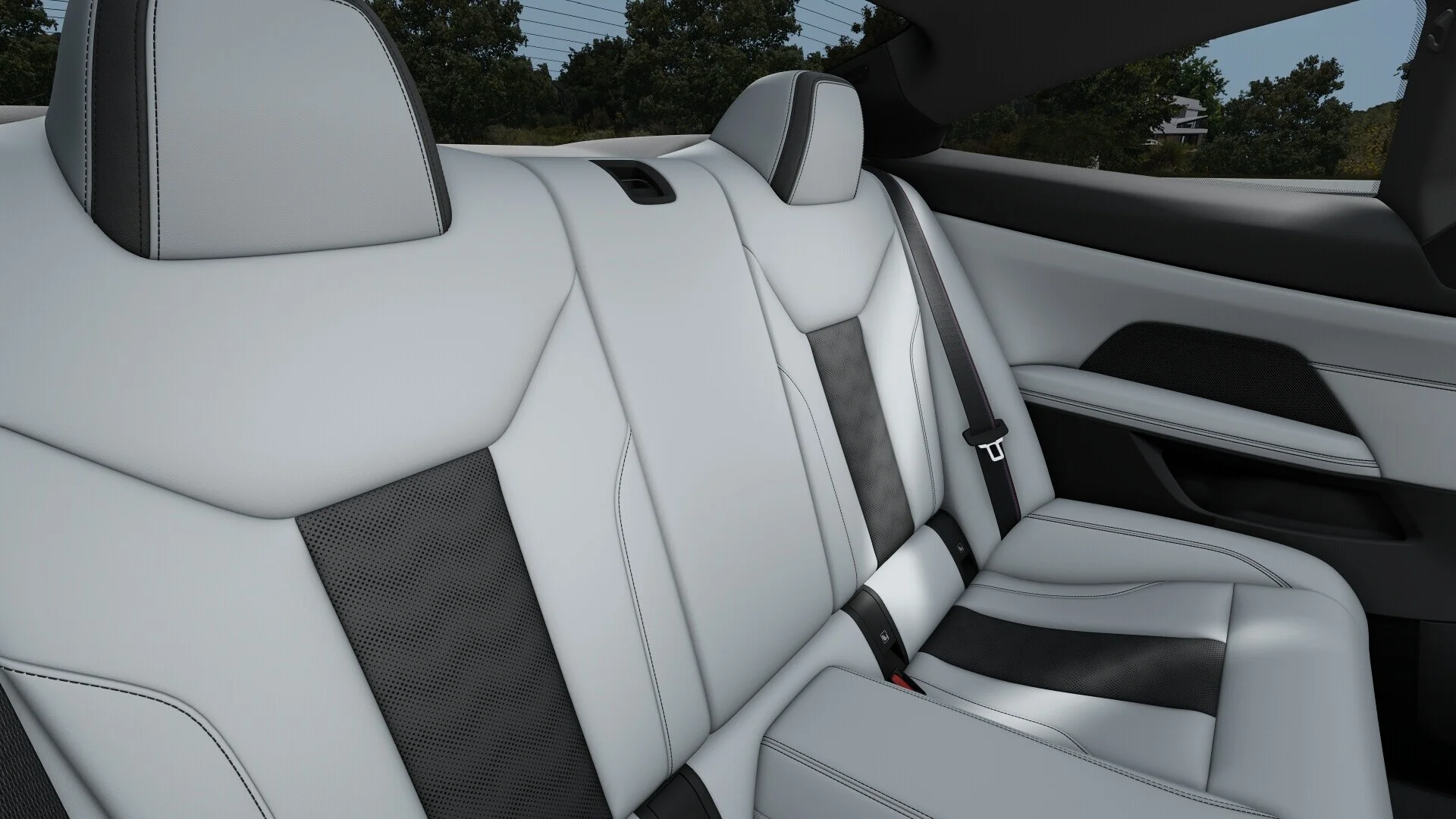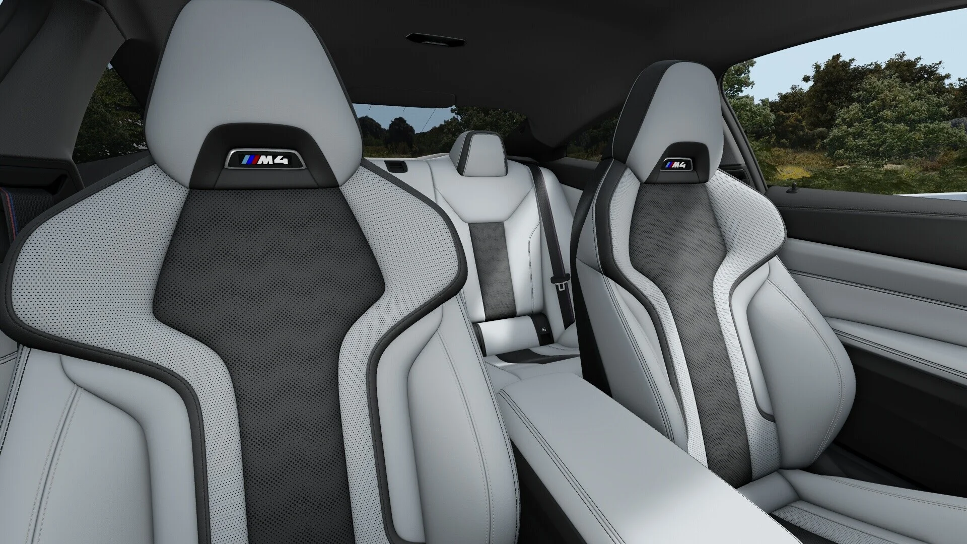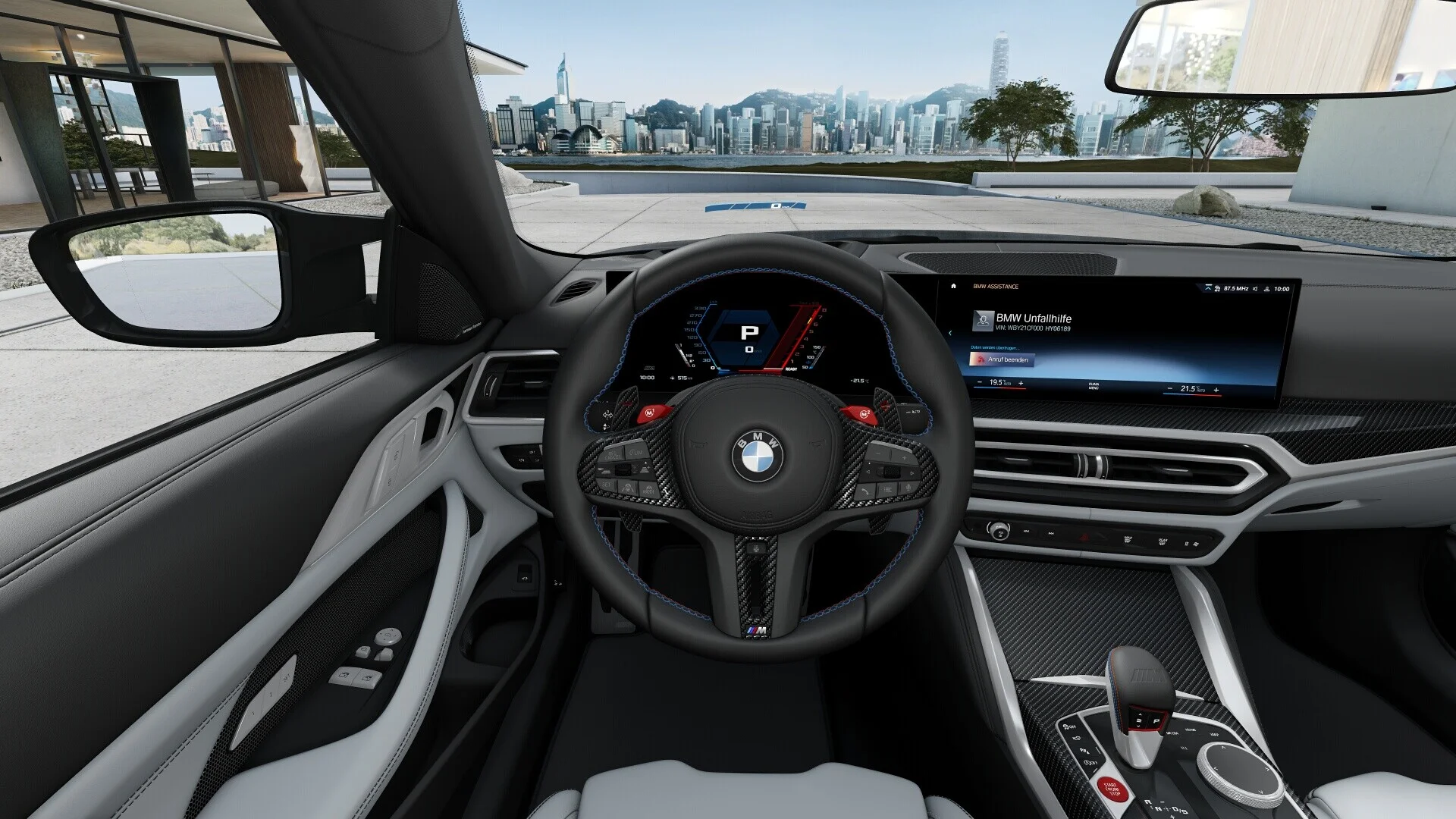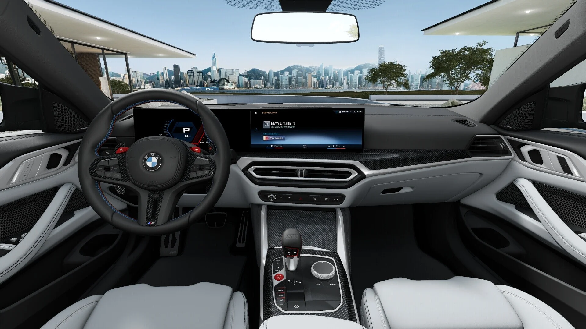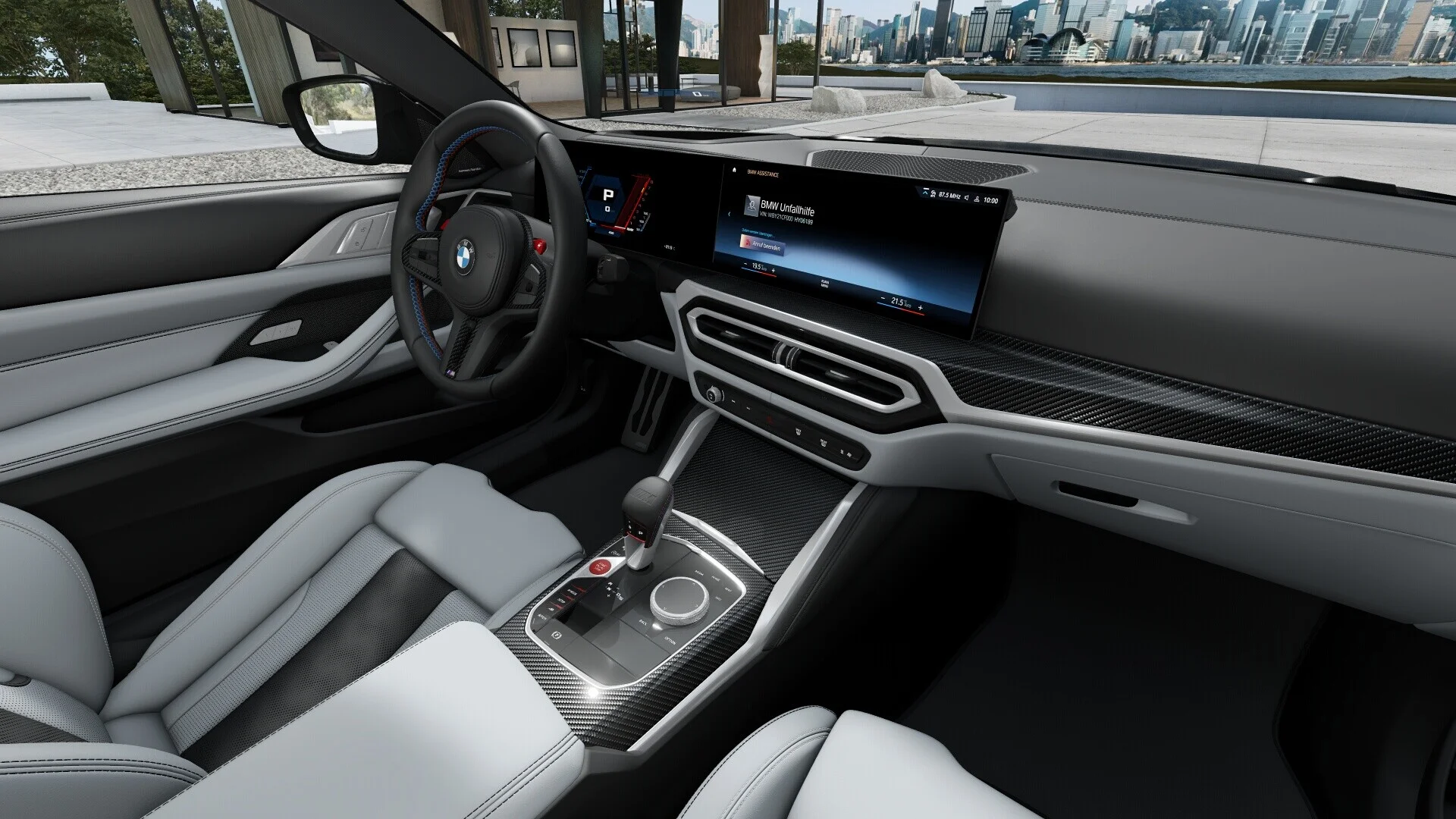 Wnętrze BMW M4 Competition Coupé zaprojektowano z myślą o najwyższym komforcie i sportowym duchu. Kabina oferuje sportowe fotele M Carbon z wyraźnym logo M, które zapewniają doskonałe podparcie podczas dynamicznej jazdy, a jednocześnie zapewniają luksusowy komfort dzięki wykończeniom z wysokiej jakości skóry Merino. Kierownica M z grubo wyściełanym wieńcem, przyciskami M Drive i łopatkami do zmiany biegów, gwarantuje precyzyjne i intuicyjne prowadzenie. Nowoczesny system multimedialny iDrive z dużym ekranem dotykowym, nawigacją oraz integracją smartfona poprzez Apple CarPlay i Android Auto, zapewnia pełną kontrolę nad funkcjami pojazdu. Cyfrowy kokpit M oferuje personalizowane ustawienia, które pozwalają kierowcy dostosować wyświetlane informacje do swoich potrzeb.