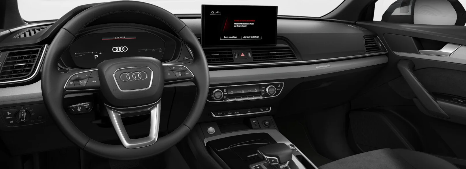 Wnętrze Audi Q5 Sportback S line zostało zaprojektowane z myślą o najwyższym komforcie i sportowym duchu. Przestronna kabina oferuje najwyższej jakości materiały, takie jak skóra i Alcantara, oraz sportowe fotele z regulacją elektryczną, które zapewniają doskonałe podparcie podczas dynamicznej jazdy. Kierownica sportowa S line z perforowaną skórą oraz łopatkami do zmiany biegów gwarantuje precyzyjne prowadzenie i pełną kontrolę nad pojazdem. Nowoczesny system multimedialny MMI Navigation Plus z dużym ekranem dotykowym, nawigacją oraz integracją smartfona poprzez Apple CarPlay i Android Auto, zapewnia łatwy dostęp do wszystkich funkcji pojazdu. Cyfrowy kokpit Audi Virtual Cockpit Plus oferuje personalizowane ustawienia, które zwiększają komfort i bezpieczeństwo jazdy.