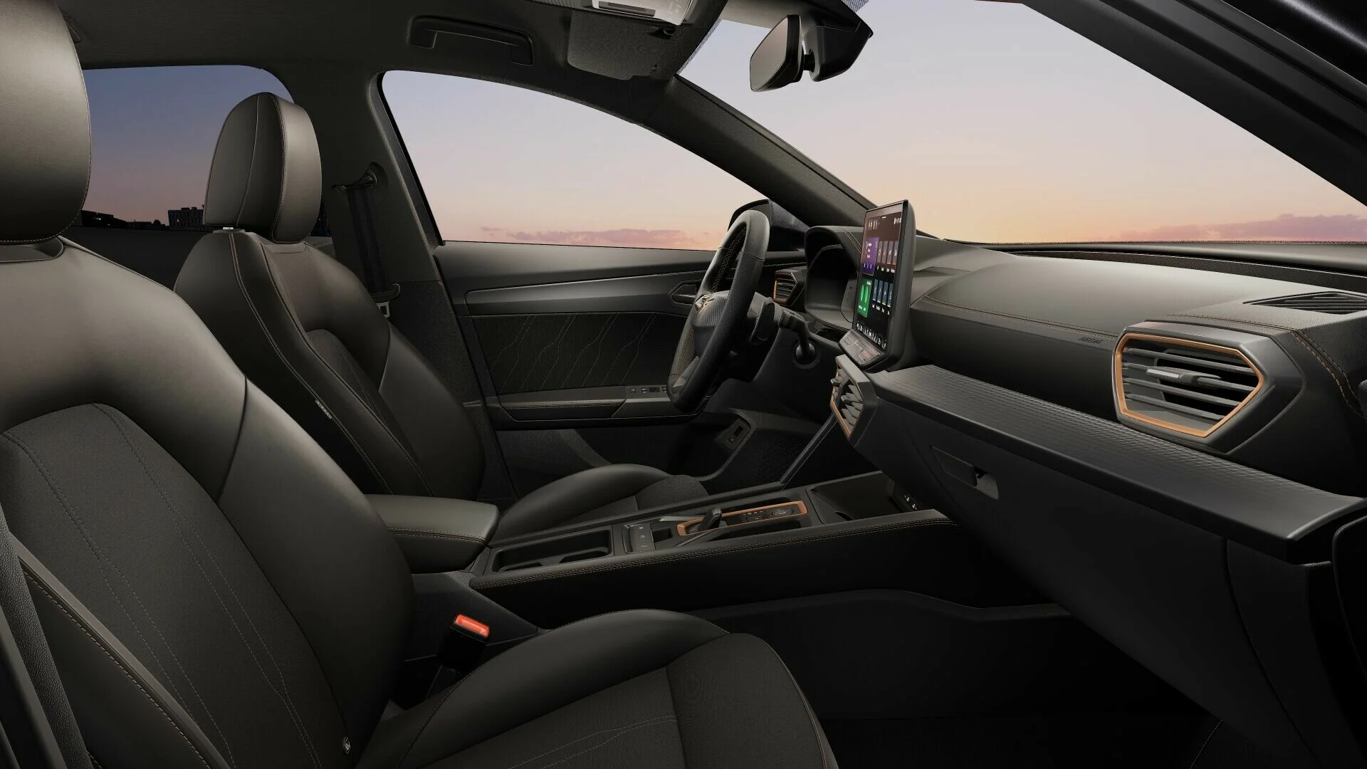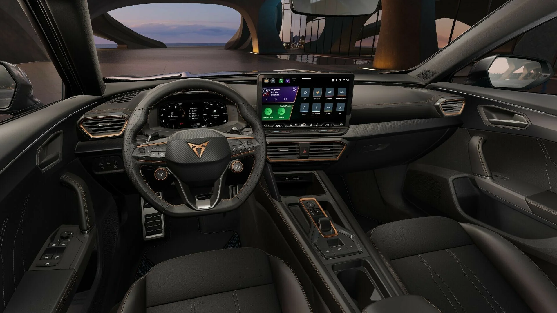 Wnętrze Cupra Formentor zostało zaprojektowane z myślą o najwyższym komforcie i funkcjonalności. Przestronna kabina oferuje wysokiej jakości materiały, ergonomiczne fotele wykończone skórą oraz przemyślane rozwiązania, które zapewniają wygodę zarówno kierowcy, jak i pasażerom. Nowoczesny system multimedialny z dużym ekranem dotykowym, nawigacją oraz integracją smartfona poprzez Apple CarPlay i Android Auto zapewnia łatwy dostęp do wszystkich funkcji pojazdu. Cyfrowy kokpit oferuje intuicyjny dostęp do informacji o pojeździe, zwiększając komfort i bezpieczeństwo jazdy.