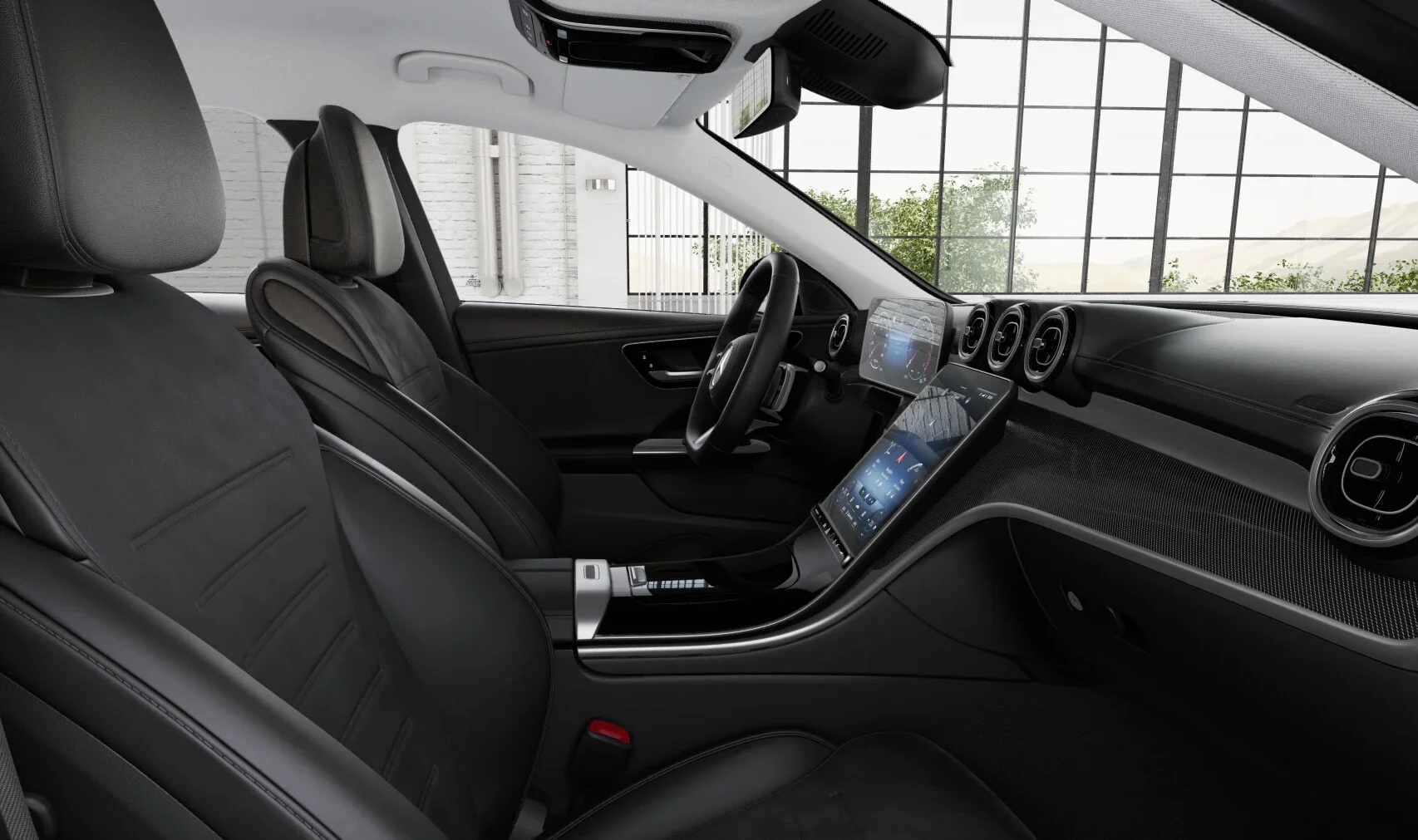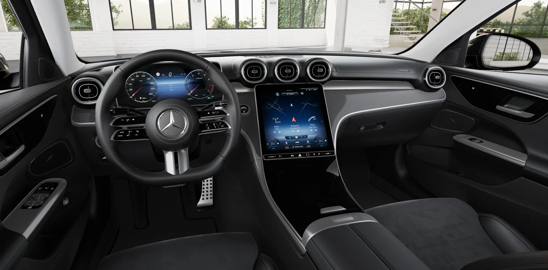 Wnętrze Mercedesa Klasy C 180 zostało zaprojektowane z myślą o najwyższym komforcie i nowoczesności. Przestronna kabina oferuje najwyższej jakości materiały, takie jak skóra i aluminium, oraz ergonomiczne fotele z funkcją regulacji elektrycznej, które zapewniają doskonały komfort zarówno kierowcy, jak i pasażerom podczas dłuższych podróży. Nowoczesny system multimedialny MBUX z dużym ekranem dotykowym, nawigacją oraz integracją smartfona poprzez Apple CarPlay i Android Auto, zapewnia pełną kontrolę nad funkcjami pojazdu. Cyfrowy kokpit z personalizowanym wyświetlaczem oferuje intuicyjny dostęp do informacji o pojeździe, co zwiększa komfort i bezpieczeństwo jazdy.