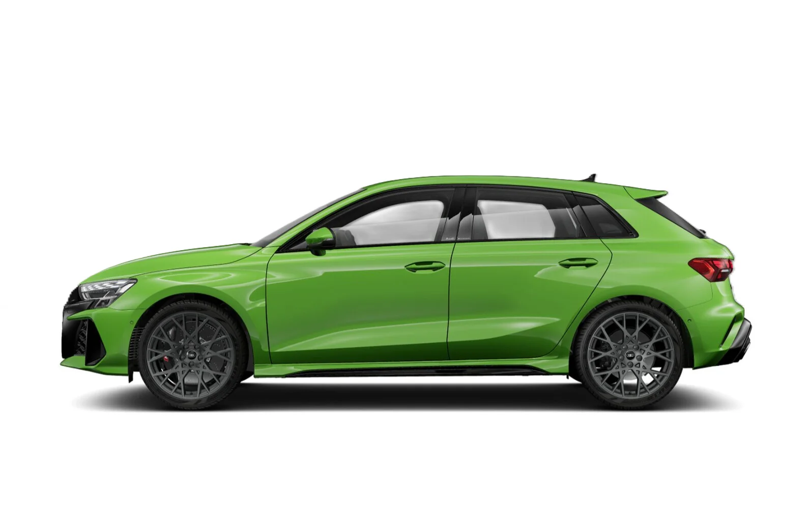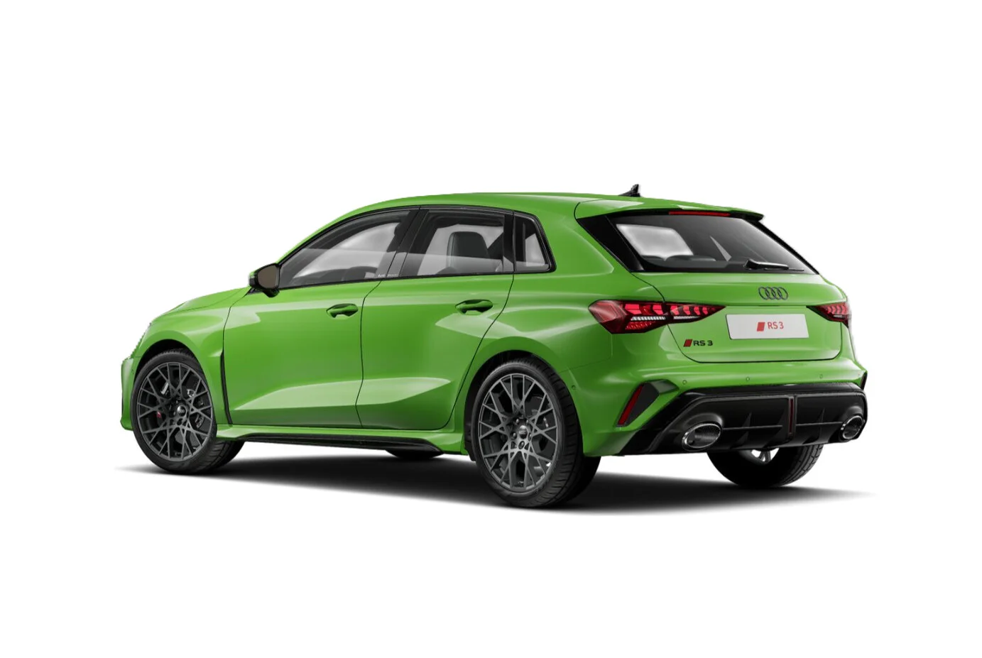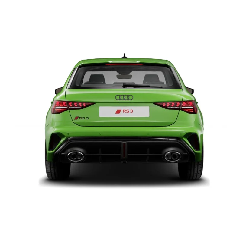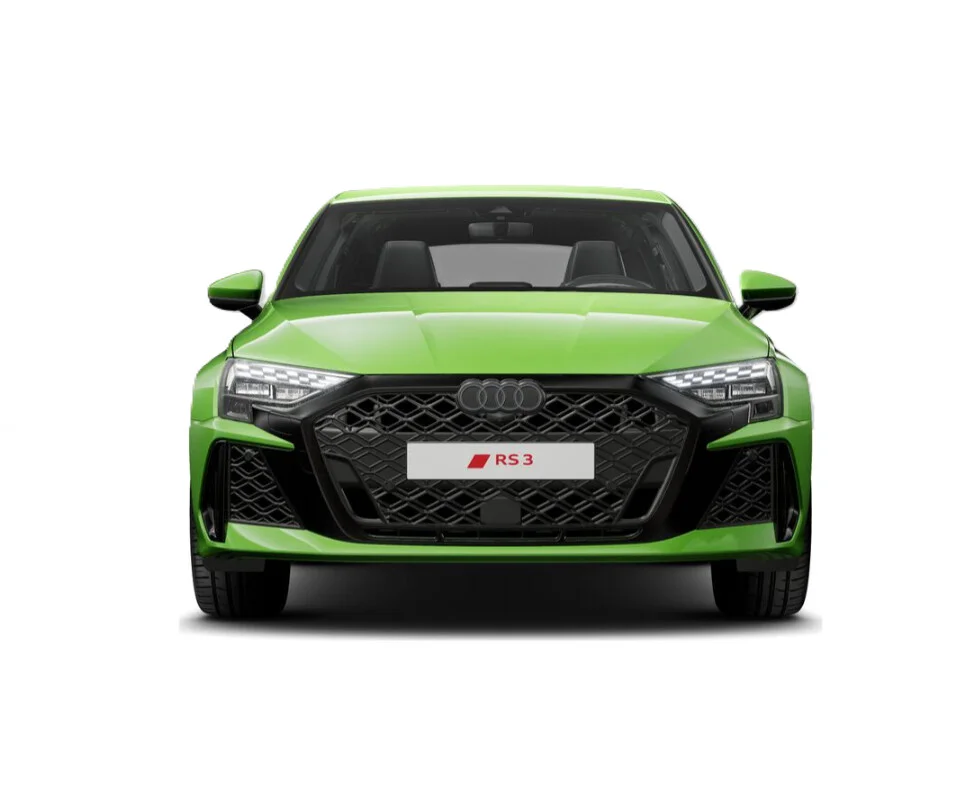 Zewnętrzny wygląd Audi RS 3 Sportback wyróżnia się wyrazistymi liniami i muskularną sylwetką, które podkreślają jego sportową naturę. Charakterystyczny grill Singleframe z logo RS, szerokie nadkola oraz smukłe reflektory LED Matrix nadają pojazdowi agresywny i dynamiczny wygląd. Sportowe detale, takie jak 19-calowe felgi aluminiowe, poszerzone zderzaki z dużymi wlotami powietrza, podwójne końcówki wydechu i dyfuzor RS, potwierdzają jego wysoką wydajność i wyścigowy rodowód.