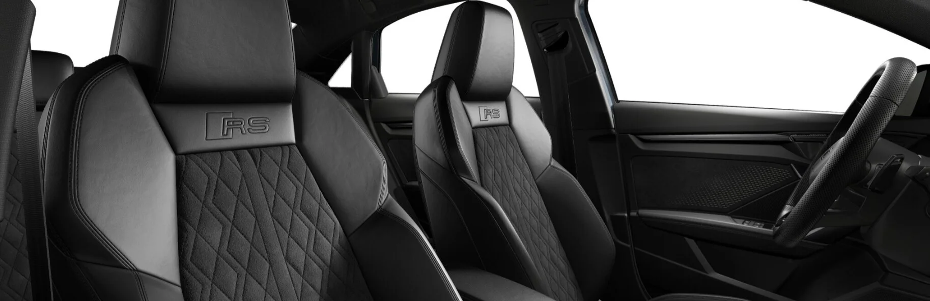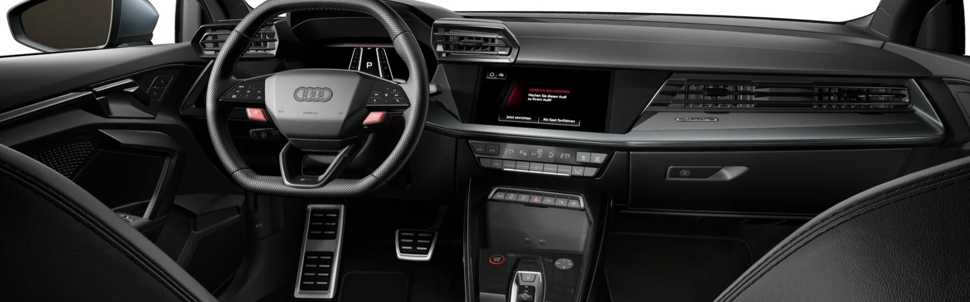 Wnętrze Audi RS 3 Limousine to połączenie najwyższej jakości materiałów i sportowego stylu. Kabina oferuje skórzane fotele RS z kontrastowymi przeszyciami, które zapewniają doskonałe podparcie, nawet podczas dynamicznej jazdy. Kierownica RS z perforowaną skórą i łopatkami do zmiany biegów oraz detale wykończenia z włókna węglowego potęgują sportowe wrażenia. Cyfrowy kokpit Audi Virtual Cockpit z personalizowanym wyświetlaczem dostarcza najważniejszych informacji o osiągach pojazdu, takich jak prędkość, obroty czy pomiar przeciążeń, a system multimedialny MMI z ekranem dotykowym zapewnia pełną integrację smartfona przez Apple CarPlay i Android Auto.