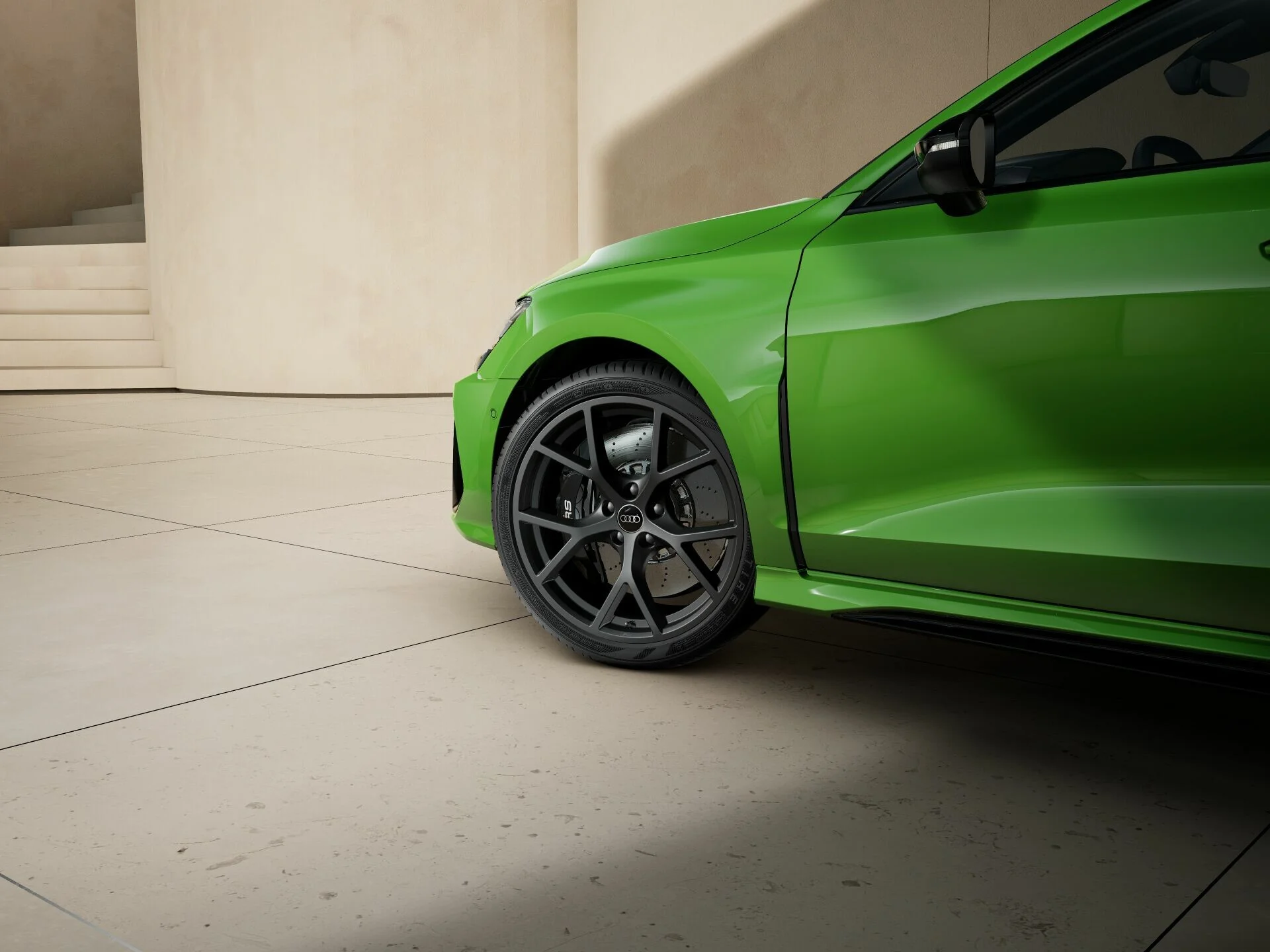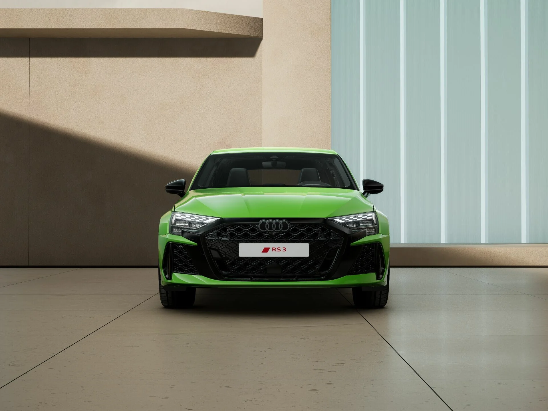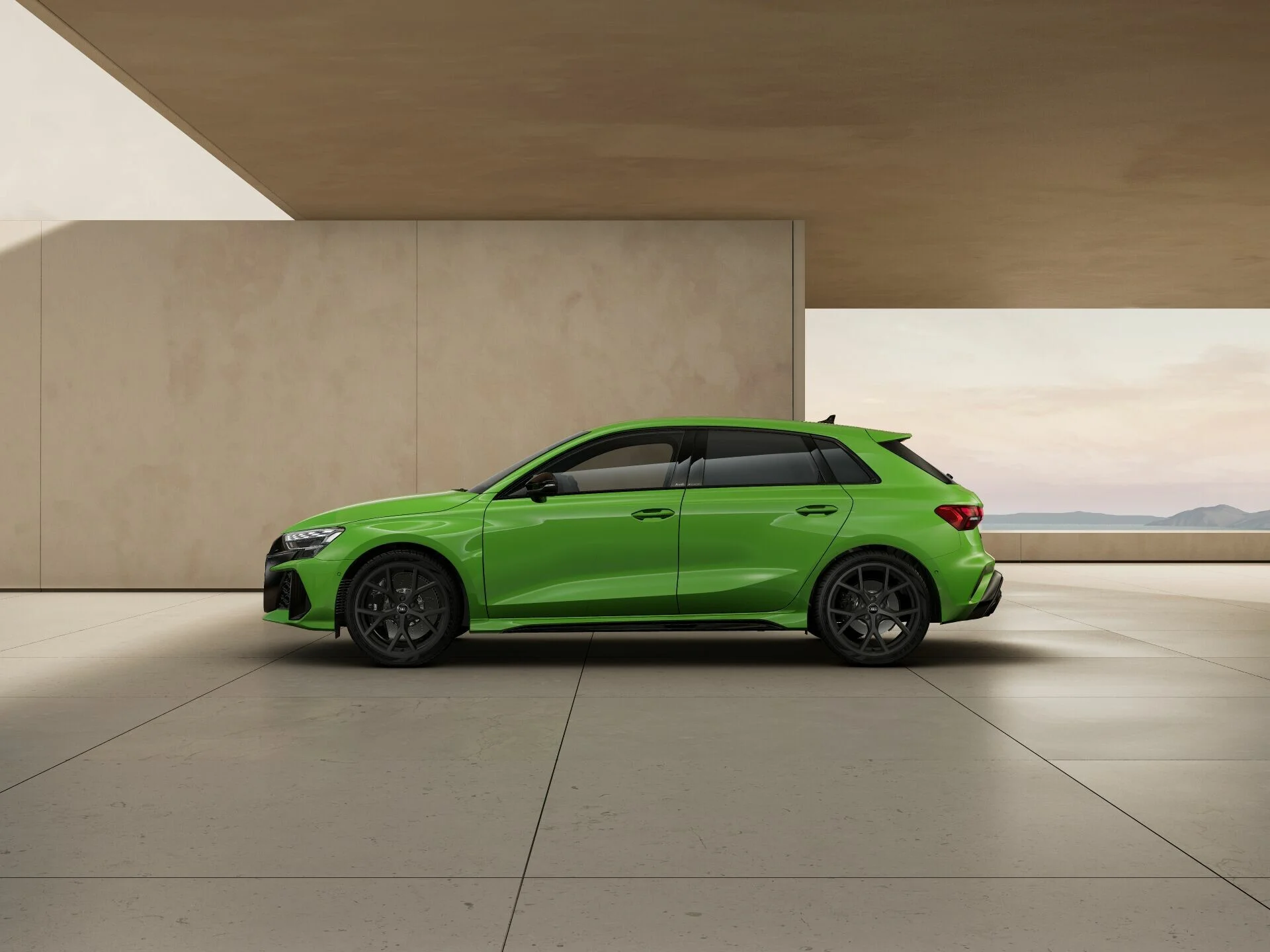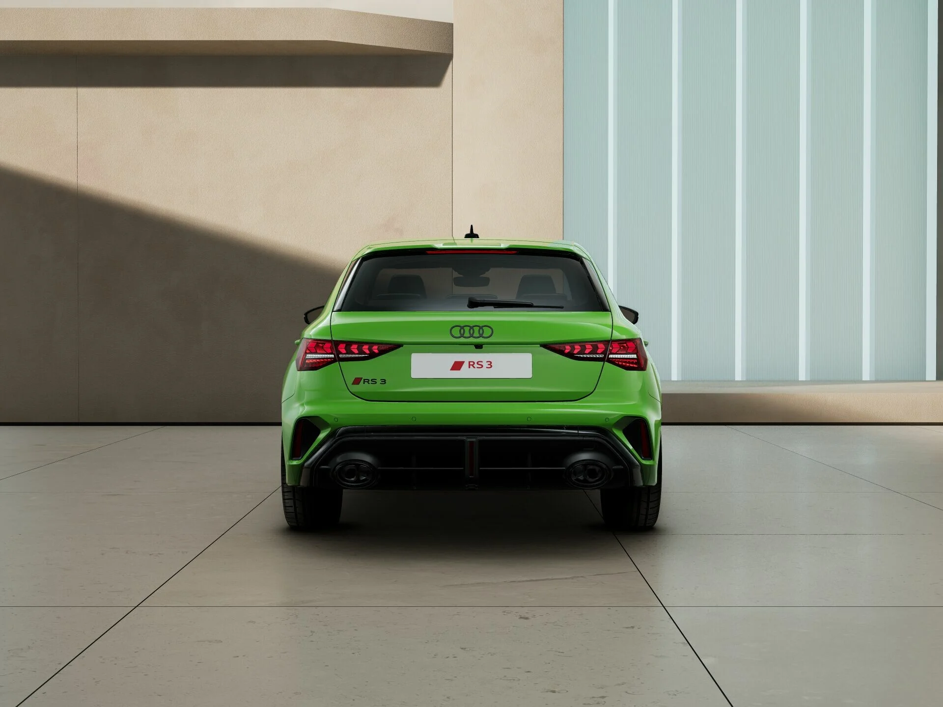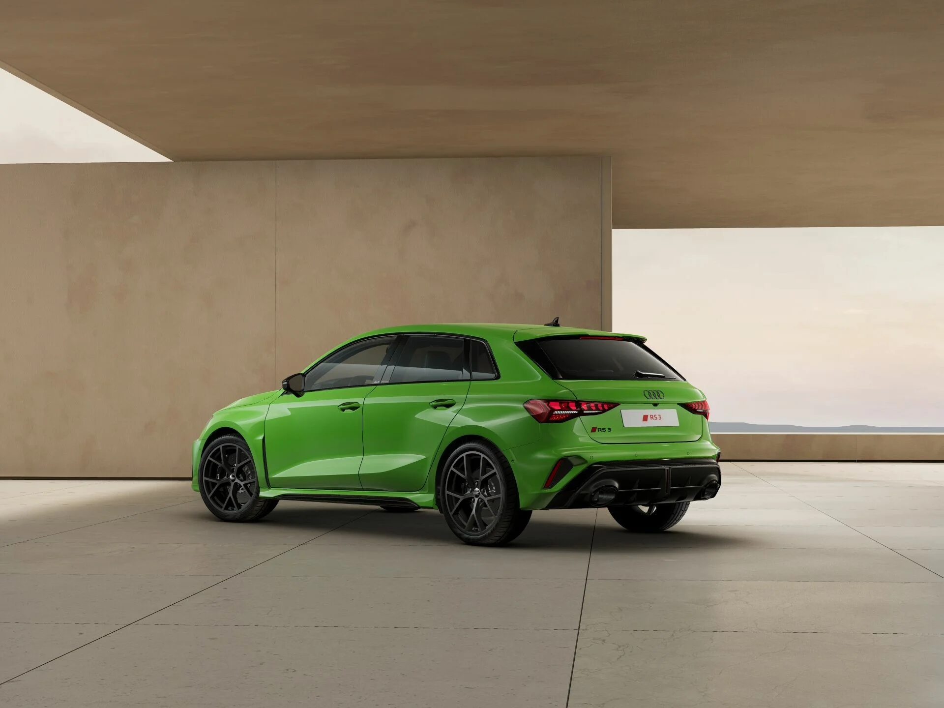Zewnętrzny wygląd Audi RS 3 Sportback wyróżnia się wyrazistymi liniami i muskularną sylwetką, które podkreślają jego sportową naturę. Charakterystyczny grill Singleframe z logo RS, szerokie nadkola oraz smukłe reflektory LED Matrix nadają pojazdowi agresywny i dynamiczny wygląd. Sportowe detale, takie jak 19-calowe felgi aluminiowe, poszerzone zderzaki z dużymi wlotami powietrza, podwójne końcówki wydechu i dyfuzor RS, potwierdzają jego wysoką wydajność i wyścigowy rodowód.