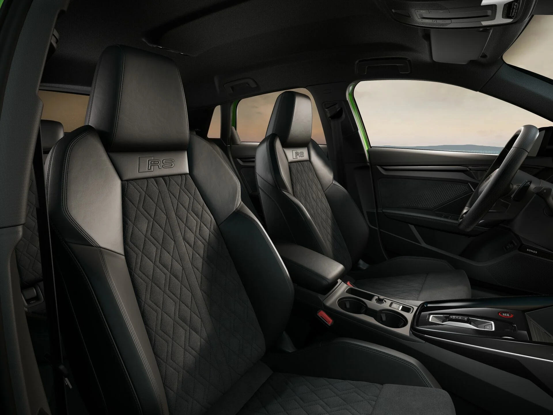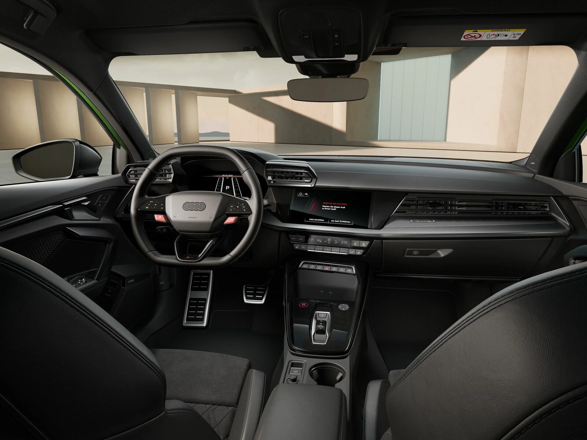 Wnętrze Audi RS 3 Sportback zostało zaprojektowane z myślą o sportowym komforcie i nowoczesnych technologiach. Przestronna kabina oferuje najwyższej jakości materiały, takie jak skóra Nappa z kontrastowymi przeszyciami, oraz sportowe fotele RS z regulacją i logo RS, które zapewniają doskonałe podparcie podczas dynamicznej jazdy. Kierownica RS z perforowaną skórą i łopatkami do zmiany biegów gwarantuje precyzyjne prowadzenie, a cyfrowy kokpit Audi Virtual Cockpit z personalizowanym wyświetlaczem dostarcza kluczowych informacji o pojazdu, takich jak tryby jazdy, osiągi czy pomiar przeciążeń.