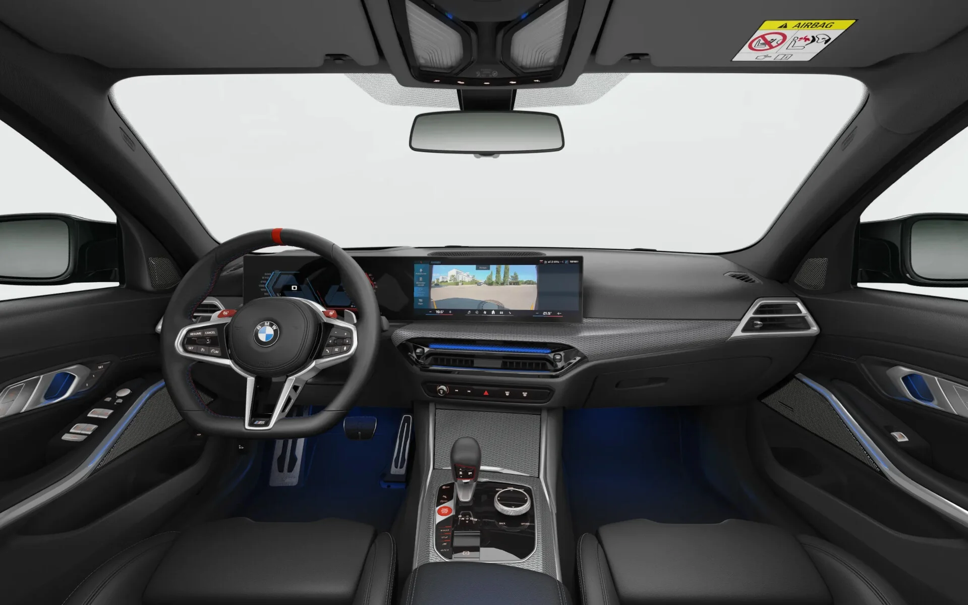 Wnętrze BMW M3 Touring to przestrzeń stworzona z myślą o luksusie i komforcie. Kabina wykończona jest materiałami najwyższej jakości, takimi jak skóra Merino oraz elementy z włókna węglowego, co tworzy elegancką atmosferę. Ergonomiczne fotele sportowe oferują doskonałe wsparcie, a przestronność kabiny zapewnia komfort zarówno dla kierowcy, jak i pasażerów. Na pokładzie znajduje się zaawansowany system multimedialny iDrive z dużym ekranem dotykowym, który obsługuje nawigację, multimedia oraz integrację z Apple CarPlay i Android Auto, co zapewnia łatwy dostęp do ulubionych aplikacji.