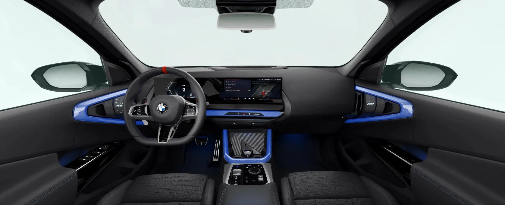 Wnętrze BMW X3 M50 xDrive zaprojektowano z myślą o najwyższym komforcie i sportowym stylu. Przestronna kabina oferuje najwyższej jakości materiały, takie jak skóra Vernasca i aluminium, oraz ergonomiczne sportowe fotele z logo M, które zapewniają doskonałe podparcie podczas dynamicznej jazdy. Nowoczesny system multimedialny iDrive z dużym ekranem dotykowym, nawigacją oraz integracją smartfona poprzez Apple CarPlay i Android Auto zapewnia łatwy dostęp do wszystkich funkcji pojazdu. Cyfrowy kokpit BMW Live Cockpit Professional z interfejsem M oferuje intuicyjny dostęp do informacji o pojeździe, zwiększając komfort i bezpieczeństwo jazdy.