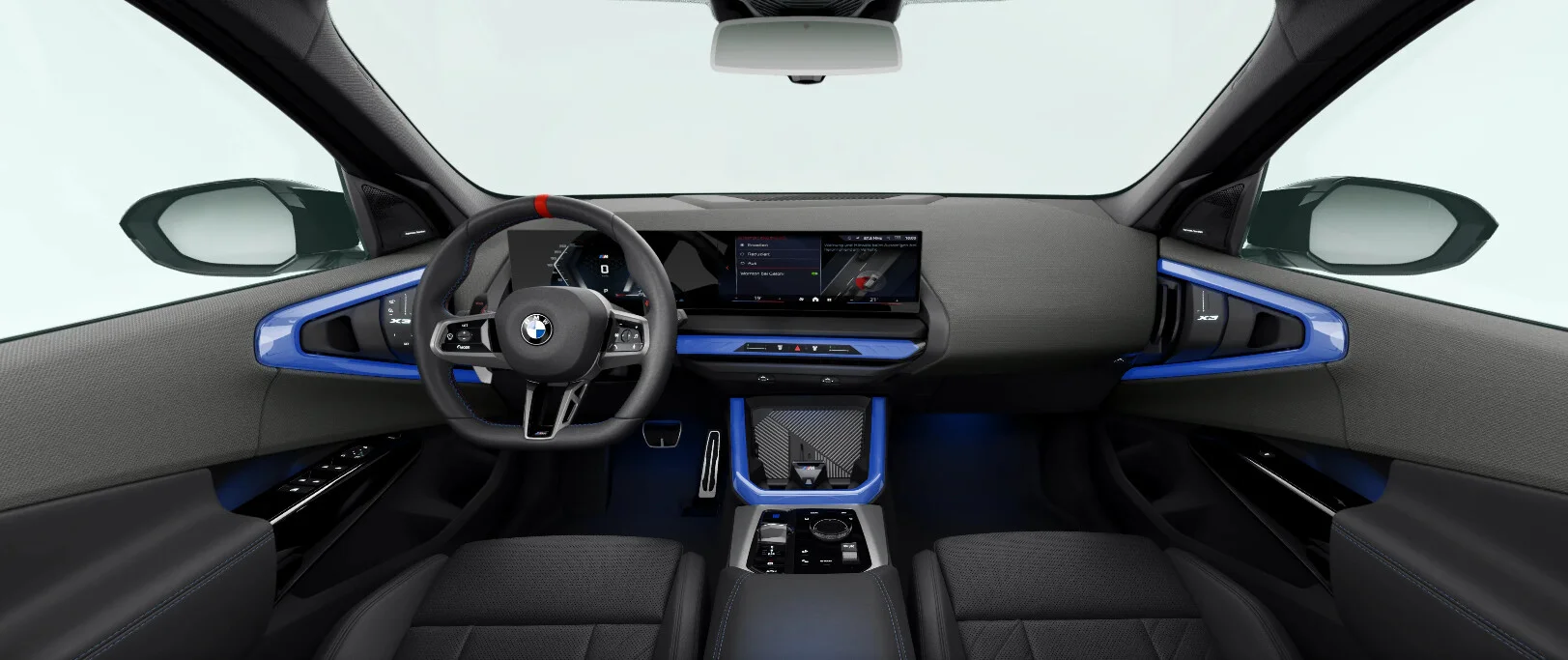 Wnętrze BMW X3 M50 xDrive zaprojektowano z myślą o najwyższym komforcie i sportowym stylu. Przestronna kabina oferuje najwyższej jakości materiały, takie jak skóra Vernasca i aluminium, oraz ergonomiczne sportowe fotele z logo M, które zapewniają doskonałe podparcie podczas dynamicznej jazdy. Nowoczesny system multimedialny iDrive z dużym ekranem dotykowym, nawigacją oraz integracją smartfona poprzez Apple CarPlay i Android Auto zapewnia łatwy dostęp do wszystkich funkcji pojazdu. Cyfrowy kokpit BMW Live Cockpit Professional z interfejsem M oferuje intuicyjny dostęp do informacji o pojeździe, zwiększając komfort i bezpieczeństwo jazdy.
