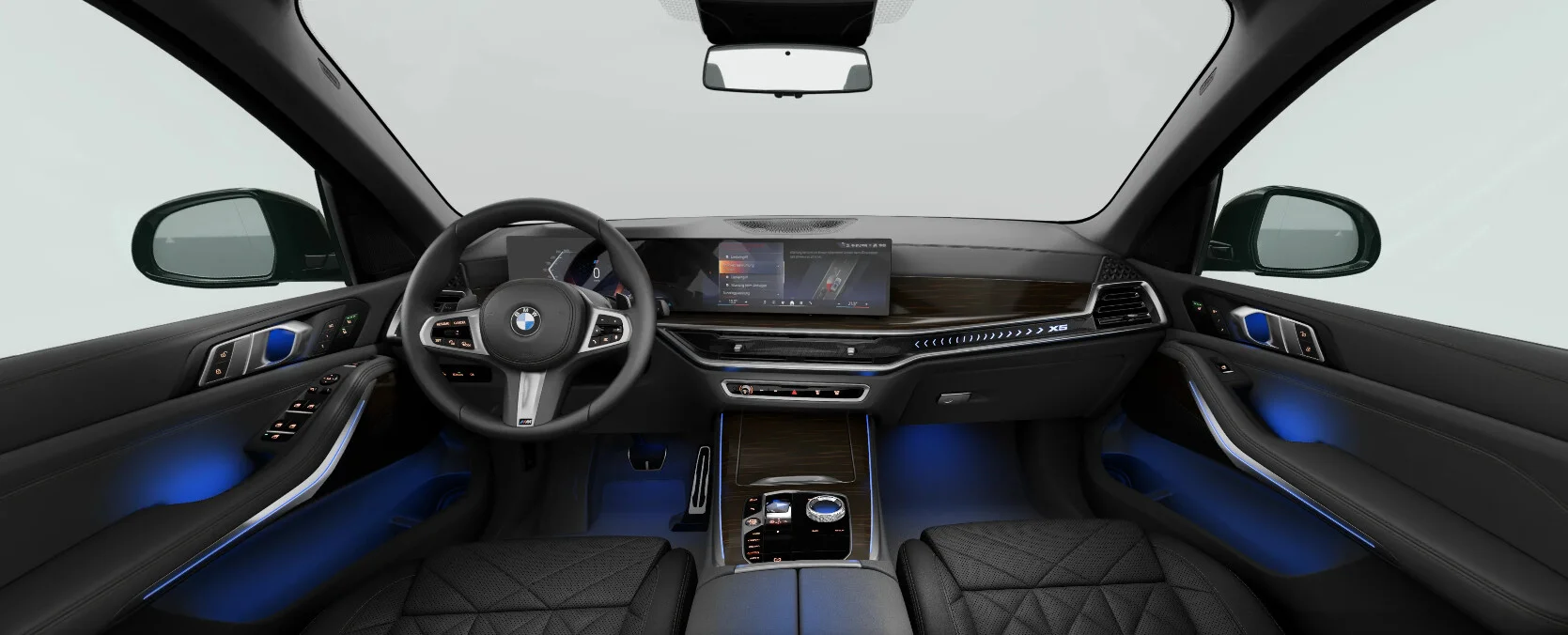 Wnętrze BMW X5 30d oferuje przestronność, luksus i najnowsze technologie. Kabina jest wykończona materiałami najwyższej jakości, takimi jak skóra Nappa oraz drewno, tworząc elegancką i komfortową atmosferę. Fotele, dostępne w wersji elektrycznie regulowanej, zapewniają doskonałe wsparcie, a przestronność kabiny sprawia, że zarówno kierowca, jak i pasażerowie cieszą się wygodą na długich trasach. Na pokładzie znajduje się system multimedialny iDrive z dużym ekranem dotykowym, który obsługuje nawigację, multimedia oraz integrację z Apple CarPlay i Android Auto, zapewniając łatwy dostęp do aplikacji. Dodatkowo, przestronność bagażnika (650 litrów) sprawia, że X5 30d jest idealnym wyborem na długie podróże, oferując wystarczającą ilość miejsca na bagaże i inne przedmioty.