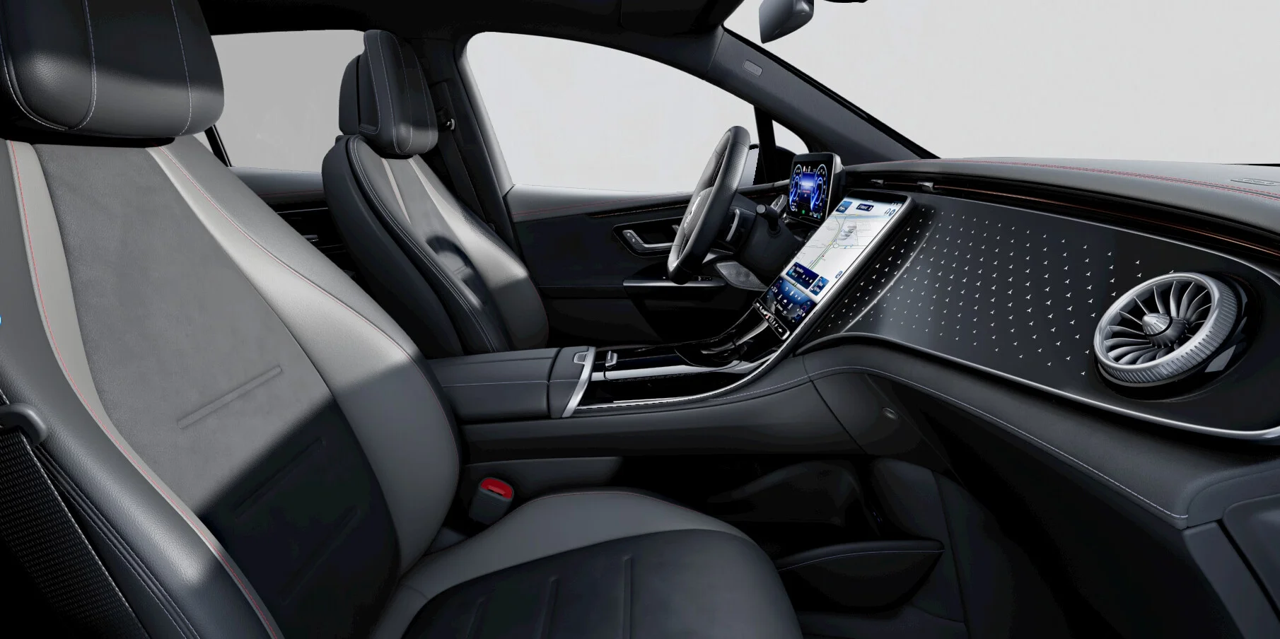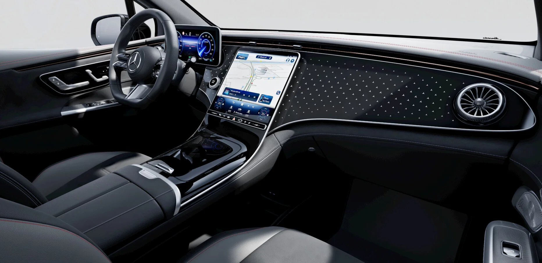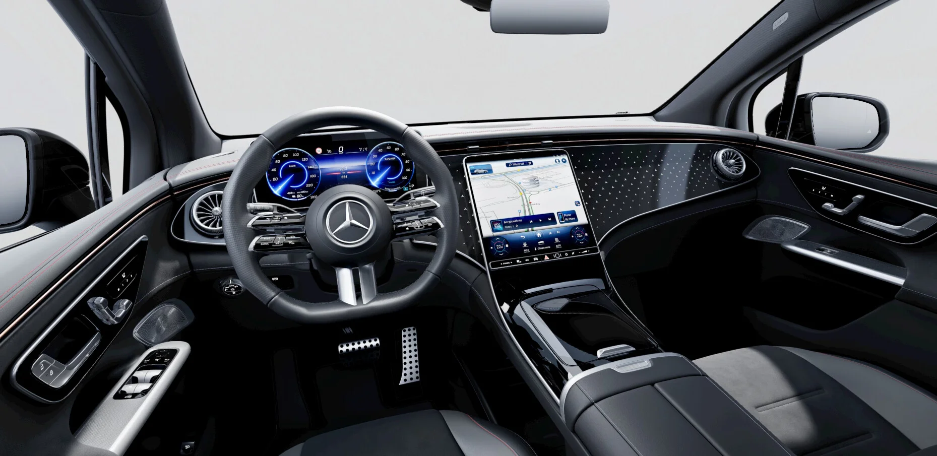 Wnętrze EQE 350 4MATIC SUV – Twoja Edycja to połączenie elegancji, komfortu i technologii. Kabina wykończona jest materiałami najwyższej jakości, takimi jak skóra Nappa, drewno oraz metalowe akcenty, które tworzą luksusową atmosferę. Wersja „Twoja Edycja” umożliwia personalizację kolorystyki wnętrza, wybór tapicerki, a także rodzaj detali wykończeniowych, aby samochód w pełni odpowiadał Twoim preferencjom. Fotele są elektrycznie regulowane i oferują funkcje podgrzewania oraz wentylacji, zapewniając komfort na każdym etapie podróży. System multimedialny MBUX z ekranem dotykowym i rozszerzoną funkcjonalnością pozwala na pełną integrację z urządzeniami mobilnymi, a także na łatwy dostęp do nawigacji, mediów i innych aplikacji.