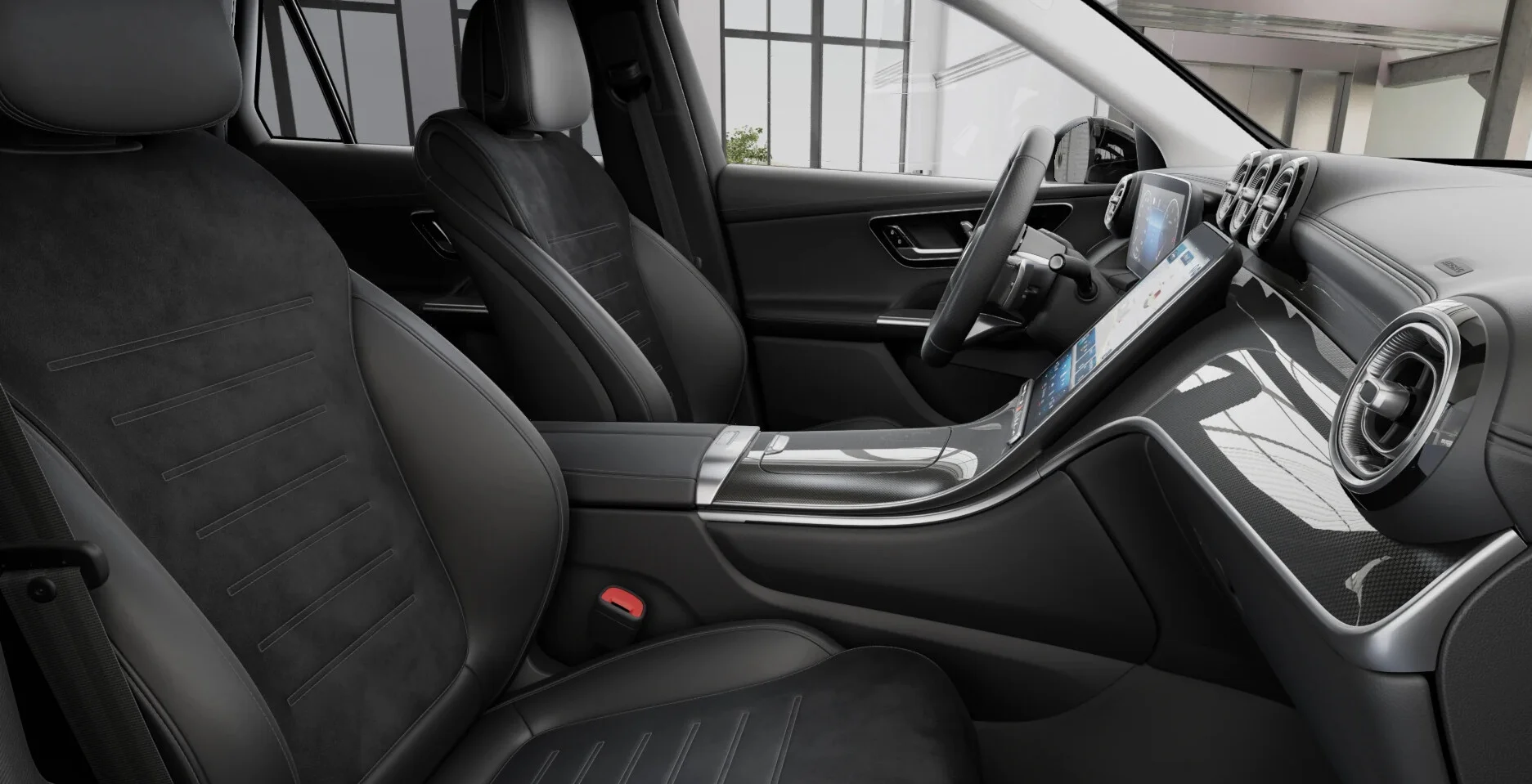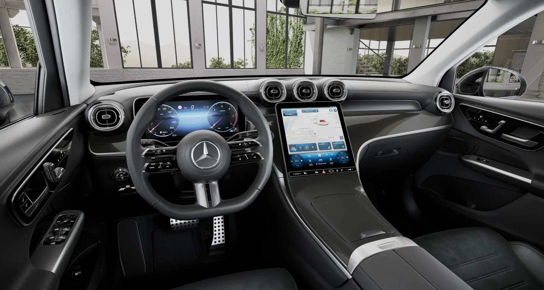 Wnętrze Mercedes-Benz GLC 220d 4MATIC to kwintesencja luksusu i komfortu. Kabina wykończona jest materiałami najwyższej jakości, takimi jak skóra, drewno, aluminium oraz miękkie plastiki, co tworzy przestronną i elegancką atmosferę. Fotele oferują doskonałe wsparcie, zarówno w codziennym użytkowaniu, jak i podczas długich podróży. Na pokładzie znajduje się system multimedialny MBUX z ekranem dotykowym, który obsługuje nawigację, multimedia oraz integrację z urządzeniami mobilnymi za pomocą Apple CarPlay i Android Auto. Dzięki przestronności wnętrza i bagażnikowi o pojemności 550 litrów, GLC 220d 4MATIC zapewnia komfort i wygodę zarówno dla pasażerów, jak i w codziennym użytkowaniu.