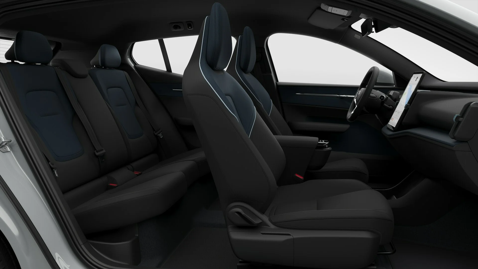 Wnętrze Volvo EX30 to przestronność, wygoda i nowoczesne technologie. Kabina została zaprojektowana w sposób minimalistyczny, ale bardzo funkcjonalny, z wykorzystaniem materiałów wysokiej jakości, takich jak ekologiczne tkaniny, drewno oraz elementy wykończeniowe z tworzyw sztucznych. Fotele zapewniają komfort podczas długich tras, a przestronność wnętrza sprawia, że EX30 jest idealnym pojazdem na co dzień. Na pokładzie znajduje się system multimedialny z dużym ekranem dotykowym, który obsługuje nawigację, multimedia oraz integrację z urządzeniami mobilnymi za pomocą Apple CarPlay i Android Auto. System audio oferuje doskonałą jakość dźwięku, a przestronny bagażnik zapewnia odpowiednią ilość miejsca na bagaże i codzienne zakupy.