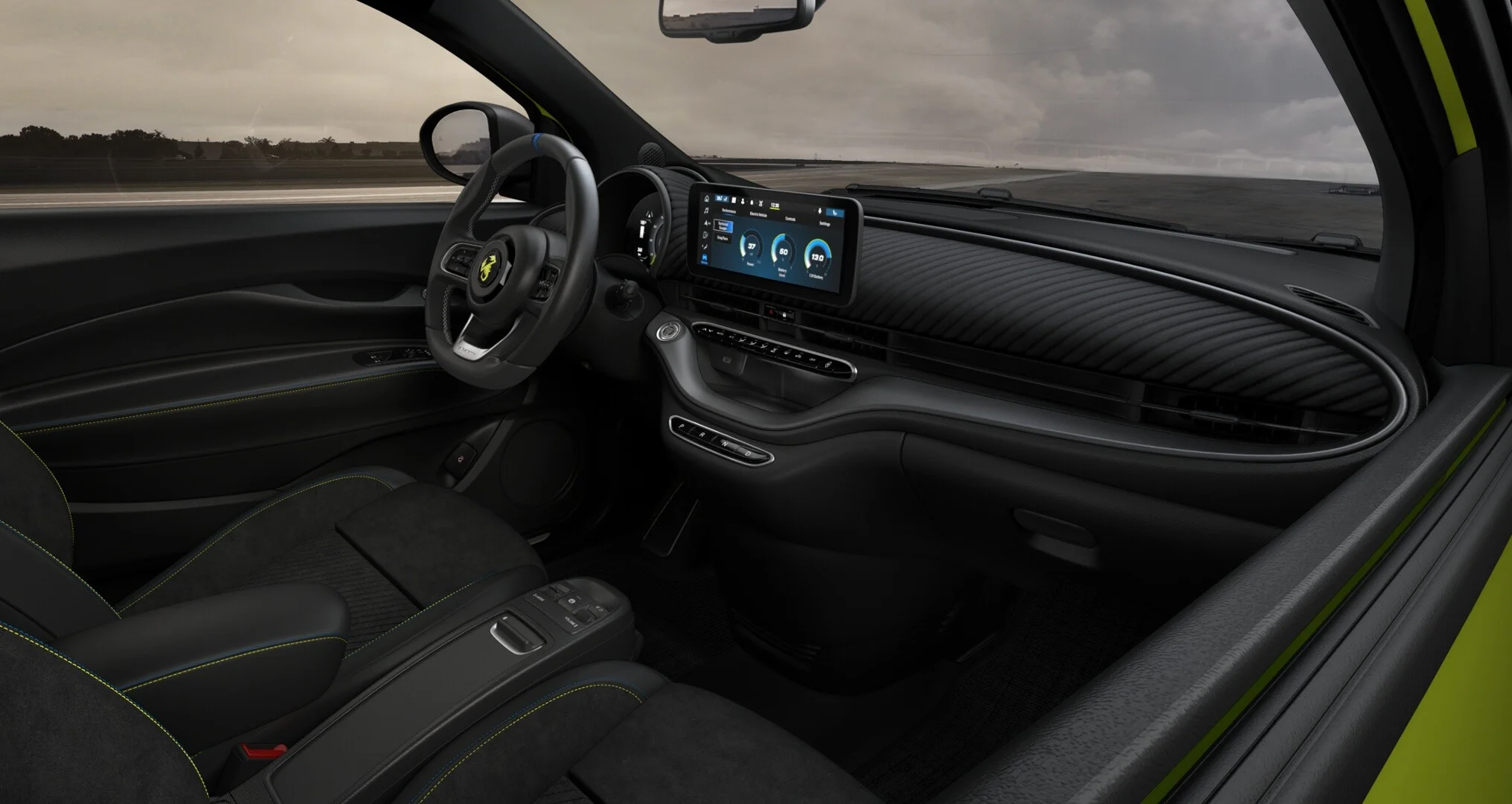Wnętrze Abarth 500e Turismo to połączenie sportowego charakteru z komfortem i nowoczesnymi technologiami. Kabina została wykończona materiałami wysokiej jakości, takimi jak skóra i materiały tekstylne, które tworzą ekskluzywną atmosferę. Fotele sportowe oferują doskonałe wsparcie podczas dynamicznej jazdy, a przestronność wnętrza zapewnia komfort dla kierowcy i pasażera. Na pokładzie znajduje się system multimedialny Uconnect, który obsługuje nawigację, multimedia oraz integrację z urządzeniami mobilnymi za pomocą Apple CarPlay i Android Auto. Dodatkowo, system audio zapewnia wysoką jakość dźwięku. Wnętrze oferuje także liczne schowki oraz przestronną kabinę, a bagażnik o pojemności 185 litrów zapewnia odpowiednią przestronność na codzienne zakupy oraz bagaże.