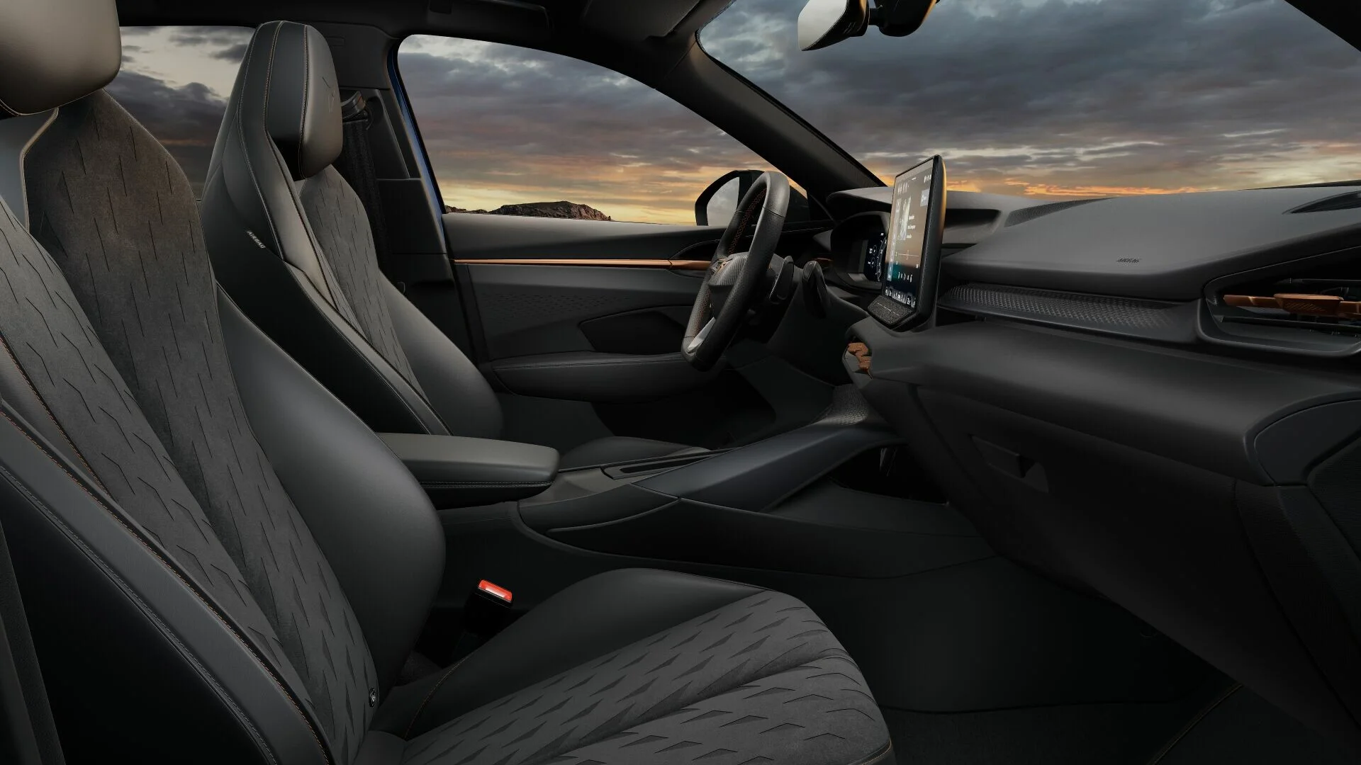 Wnętrze CUPRA Terramar 1.5 e-TSI DSG to przestronność, komfort i nowoczesne technologie. Kabina została wykończona materiałami wysokiej jakości, takimi jak skóra, alcantara oraz elementy wykończeniowe w kolorze matowego aluminium, które tworzą ekskluzywną atmosferę. Fotele sportowe zapewniają doskonałe wsparcie na zakrętach i długich trasach, a przestronność wnętrza gwarantuje komfort zarówno kierowcy, jak i pasażerów. Na pokładzie znajduje się system multimedialny CUPRA Connect z dużym ekranem dotykowym, który obsługuje nawigację, multimedia oraz integrację z urządzeniami mobilnymi za pomocą Apple CarPlay i Android Auto. Dodatkowo, system audio BeatsAudio zapewnia doskonałą jakość dźwięku. Bagażnik o pojemności 450 litrów zapewnia odpowiednią ilość miejsca na codzienne zakupy oraz bagaże na długie podróże.