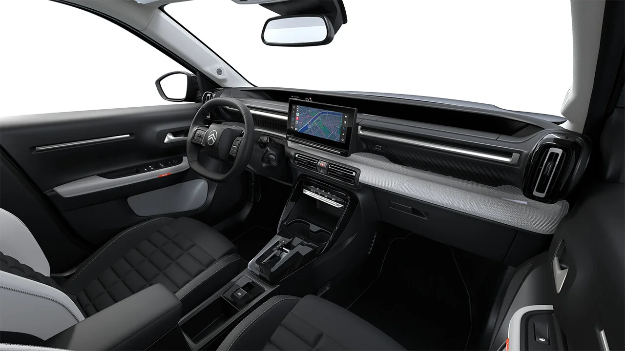 Wnętrze Citroena C3 Aircross to przestronność, komfort i nowoczesne technologie. Kabina pojazdu została zaprojektowana z myślą o komforcie zarówno kierowcy, jak i pasażerów. Fotele są ergonomiczne, zapewniając wygodę na długich trasach oraz w codziennym użytkowaniu. Na pokładzie znajduje się system multimedialny z 7-calowym ekranem dotykowym, który obsługuje nawigację, multimedia oraz integrację z urządzeniami mobilnymi za pomocą Apple CarPlay i Android Auto. Dodatkowo, system audio zapewnia dobrą jakość dźwięku, a przestronny bagażnik o pojemności 410 litrów zapewnia wystarczającą ilość miejsca na bagaże i zakupy.