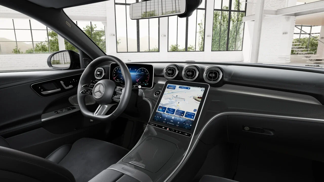 Wnętrze Mercedes-Benz C 300 to połączenie luksusu, komfortu i nowoczesnych technologii. Kabina pojazdu została zaprojektowana z myślą o wygodzie kierowcy i pasażerów. Fotele wykonane z najwyższej jakości materiałów zapewniają wygodę na długich trasach, a przestronność wnętrza sprawia, że każda podróż jest komfortowa. Na pokładzie znajduje się system multimedialny MBUX z 12,3-calowym ekranem dotykowym, który obsługuje nawigację, multimedia oraz integrację z urządzeniami mobilnymi za pomocą Apple CarPlay i Android Auto. Dodatkowo, system audio Burmester zapewnia doskonałą jakość dźwięku, a automatyczna klimatyzacja utrzymuje optymalną temperaturę wewnątrz pojazdu. Bagażnik o pojemności 455 litrów zapewnia wystarczającą ilość miejsca na bagaże i zakupy.