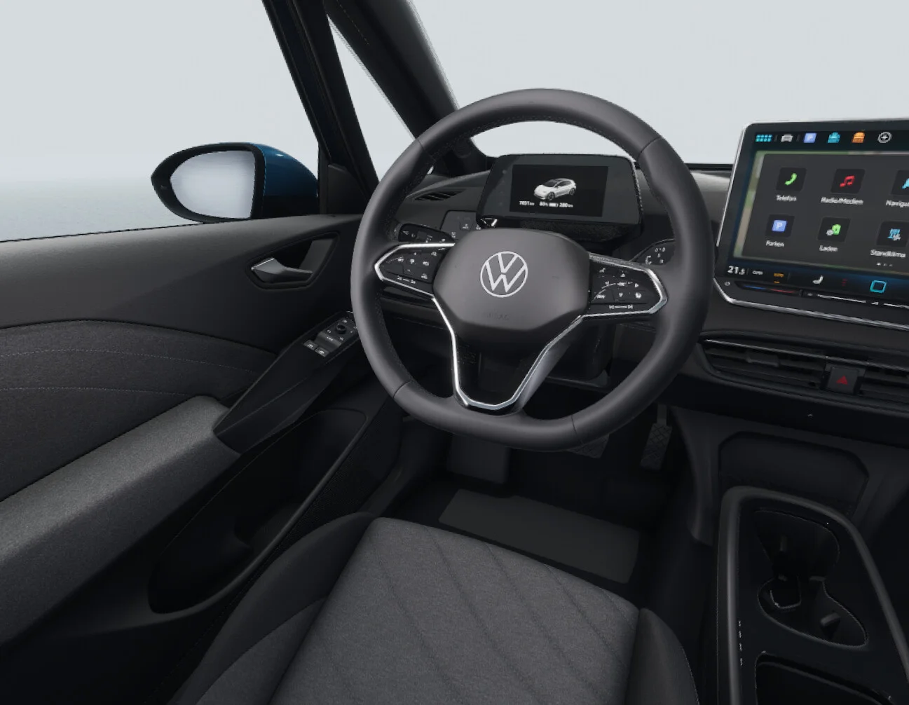 Wnętrze Volkswagena ID.3 to przestronność, komfort i nowoczesne technologie. Kabina została zaprojektowana z myślą o maksymalnym komforcie pasażerów i kierowcy. Fotele oferują wygodę i dobrą ergonomię, a nowoczesne wykończenie wnętrza sprawia, że podróże stają się przyjemnością. Na pokładzie znajduje się system multimedialny z ekranem dotykowym o przekątnej 10 cali, który obsługuje nawigację, multimedia oraz integrację z urządzeniami mobilnymi za pomocą Apple CarPlay i Android Auto. Dodatkowo, ID.3 oferuje system audio, który zapewnia wysoką jakość dźwięku, a automatyczna klimatyzacja utrzymuje optymalną temperaturę wewnątrz pojazdu. Pojazd oferuje przestronny bagażnik o pojemności 385 litrów, co sprawia, że ID.3 jest wystarczająco przestronny do codziennych zakupów oraz długich podróży.
