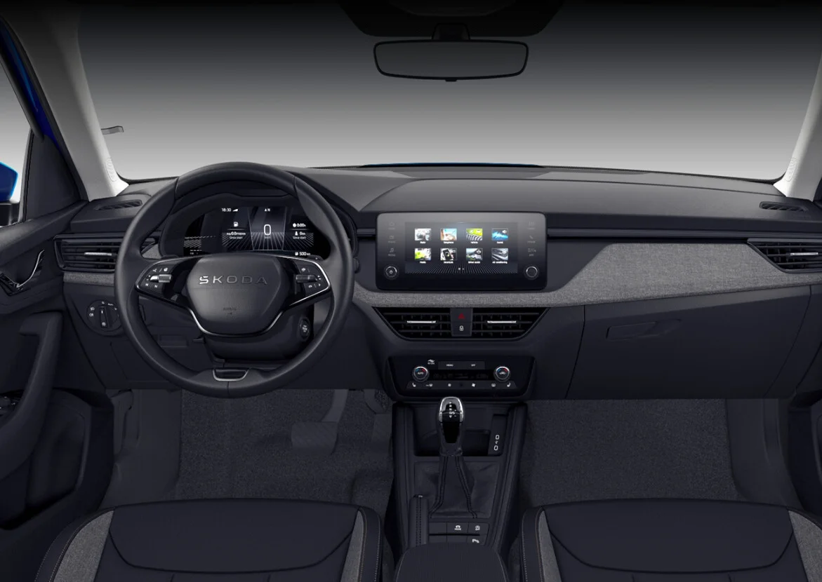 Wnętrze Škody Kamiq to przestronność, komfort oraz nowoczesne technologie. Kabina została zaprojektowana z myślą o wygodzie kierowcy i pasażerów. Fotele oferują wygodę i dobrą ergonomię, zapewniając komfort zarówno w krótkich, jak i długich podróżach. Na pokładzie znajduje się system multimedialny z 9,2-calowym ekranem dotykowym, który obsługuje nawigację, multimedia oraz integrację z urządzeniami mobilnymi za pomocą Apple CarPlay i Android Auto. Dodatkowo, system audio oferuje doskonałą jakość dźwięku, a automatyczna klimatyzacja zapewnia odpowiednią temperaturę wewnątrz pojazdu. Pojazd oferuje przestronny bagażnik o pojemności 400 litrów, co daje wystarczającą ilość miejsca na codzienne zakupy oraz bagaże na długie podróże.