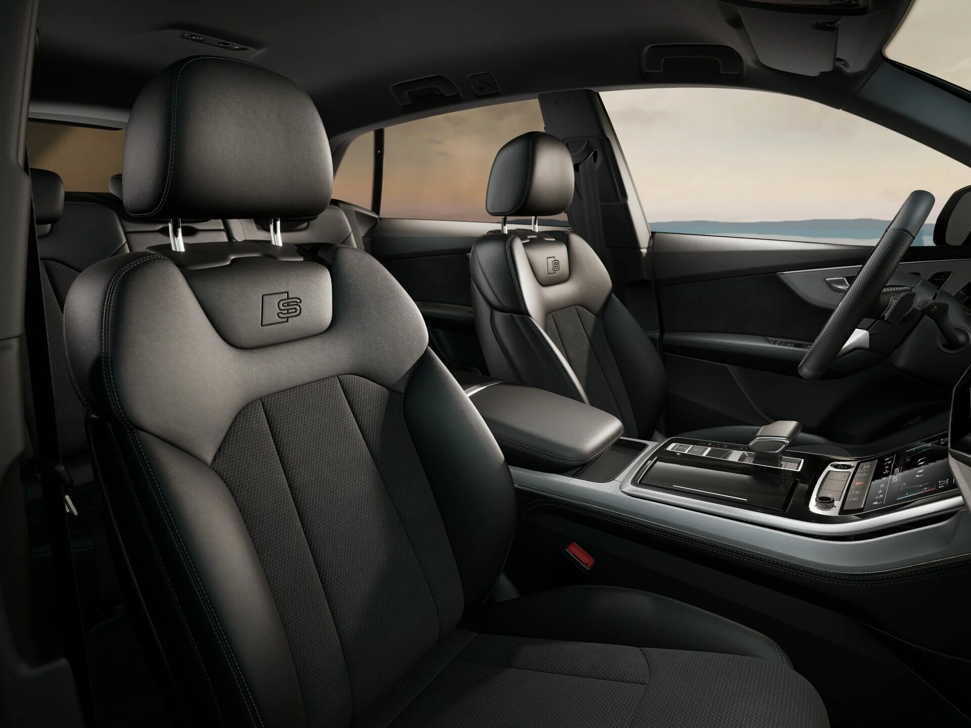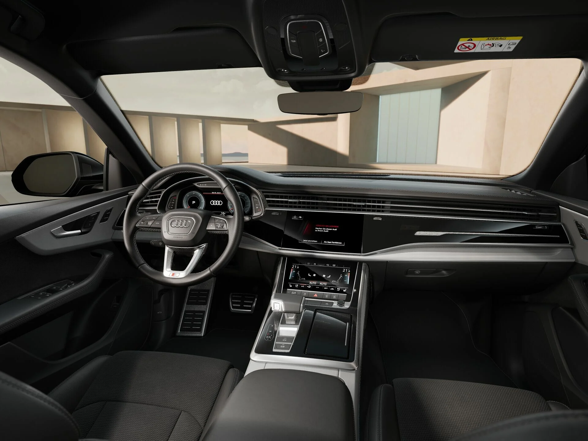 Wnętrze Audi Q8 to synonim luksusu i komfortu. Kabina jest przestronna i wykończona najwyższej jakości materiałami, takimi jak skóra Valcona, drewno i aluminium, które tworzą ekskluzywną atmosferę. Fotele są wyposażone w funkcje regulacji elektrycznej, podgrzewania i wentylacji, co zapewnia maksymalny komfort podróżującym. System MMI Touch Response z dwoma ekranami dotykowymi o wysokiej rozdzielczości oraz Audi Virtual Cockpit zapewniają pełną kontrolę nad funkcjami pojazdu i dają dostęp do multimediów, nawigacji oraz ustawień pojazdu. Zintegrowana obsługa Apple CarPlay i Android Auto pozwala na wygodną integrację smartfona.