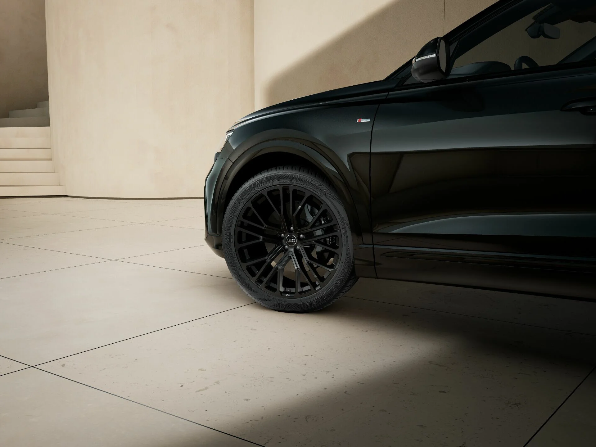Zewnętrzny wygląd Audi Q8 wyróżnia się muskularnymi liniami i sportowym charakterem, który podkreślają szeroki grill Singleframe, dynamiczne reflektory LED Matrix oraz wyraziste linie nadwozia. Jego sylwetka przyciąga uwagę dzięki szerokim nadkolom i subtelnym chromowanym akcentom, a 21-calowe felgi aluminiowe dodają pojazdowi agresywnego i nowoczesnego wyglądu.