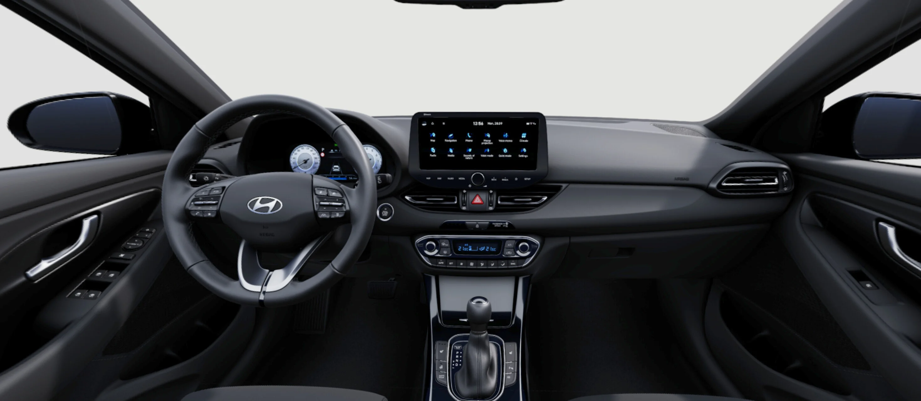 W kabinie i30 Wagon kierowca i pasażerowie mogą liczyć na wysoki komfort podróżowania. Fotele pokryte materiałową tapicerką są wygodne i dobrze wyprofilowane, a regulowany fotel kierowcy i wielofunkcyjna kierownica ułatwiają znalezienie idealnej pozycji za kierownicą. System multimedialny z ekranem dotykowym 10,25” oferuje dostęp do Apple CarPlay, Android Auto, nawigacji oraz radia cyfrowego DAB. Automatyczna klimatyzacja, tylne czujniki parkowania i kamera cofania podnoszą wygodę użytkowania każdego dnia.