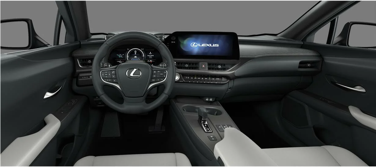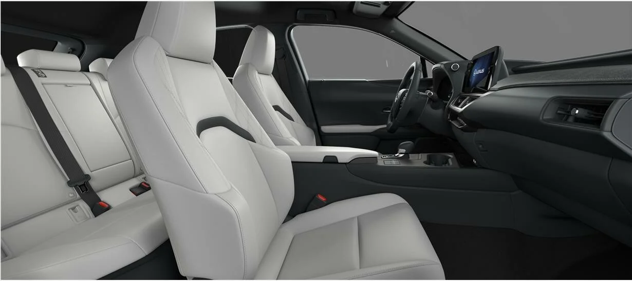 Wnętrze Lexus UX 300h zostało zaprojektowane z myślą o najwyższym komforcie i funkcjonalności. Przestronna kabina oferuje wysokiej jakości materiały, takie jak skóra i miękkie tworzywa, oraz ergonomiczne fotele z elektryczną regulacją i funkcją podgrzewania, które zapewniają wygodę zarówno kierowcy, jak i pasażerom. Nowoczesny system multimedialny Lexus Interface z dużym ekranem dotykowym, nawigacją oraz integracją smartfona poprzez Apple CarPlay i Android Auto zapewnia łatwy dostęp do wszystkich funkcji pojazdu. Cyfrowy kokpit Lexus oferuje intuicyjny dostęp do informacji o pojeździe, zwiększając komfort i bezpieczeństwo jazdy.