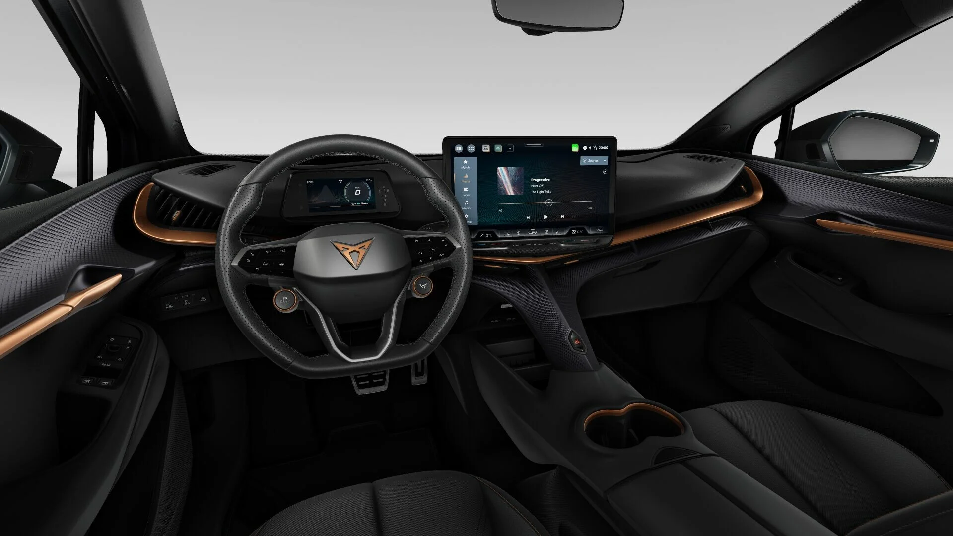 Wnętrze Cupra Tavascan to połączenie nowoczesnych technologii z komfortem. Kabina oferuje przestronność, której nie można się spodziewać po elektrycznym SUV-ie. Fotele wykończone materiałami wysokiej jakości, takie jak skóra i alcantara, zapewniają doskonałe wsparcie oraz komfort podczas długich tras. Na pokładzie pojazdu znajduje się system multimedialny z dużym ekranem dotykowym, który obsługuje nawigację, multimedia oraz integrację z urządzeniami mobilnymi za pomocą Apple CarPlay i Android Auto. Zestaw cyfrowych wskaźników daje kierowcy pełną kontrolę nad pojazdem, a przestronność wnętrza, z dużą ilością miejsca zarówno z przodu, jak i z tyłu, sprawia, że każda podróż staje się przyjemnością.