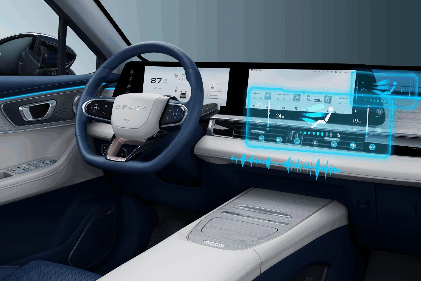 We wnętrzu kierowcę i pasażerów witają dwa duże zakrzywione ekrany o przekątnej 12,3 cala każdy, sterujące m.in. systemem multimedialnym i klimatyzacją. Bezprzewodowy Android Auto™ i Apple CarPlay™, ładowarka indukcyjna o mocy 50W, a także system audio SONY z 8 głośnikami zapewniają przyjemność z każdej podróży. Wnętrze wzbogacają podgrzewane i wentylowane fotele przednie, podgrzewana tylna kanapa oraz ambientowe oświetlenie z możliwością wyboru koloru.