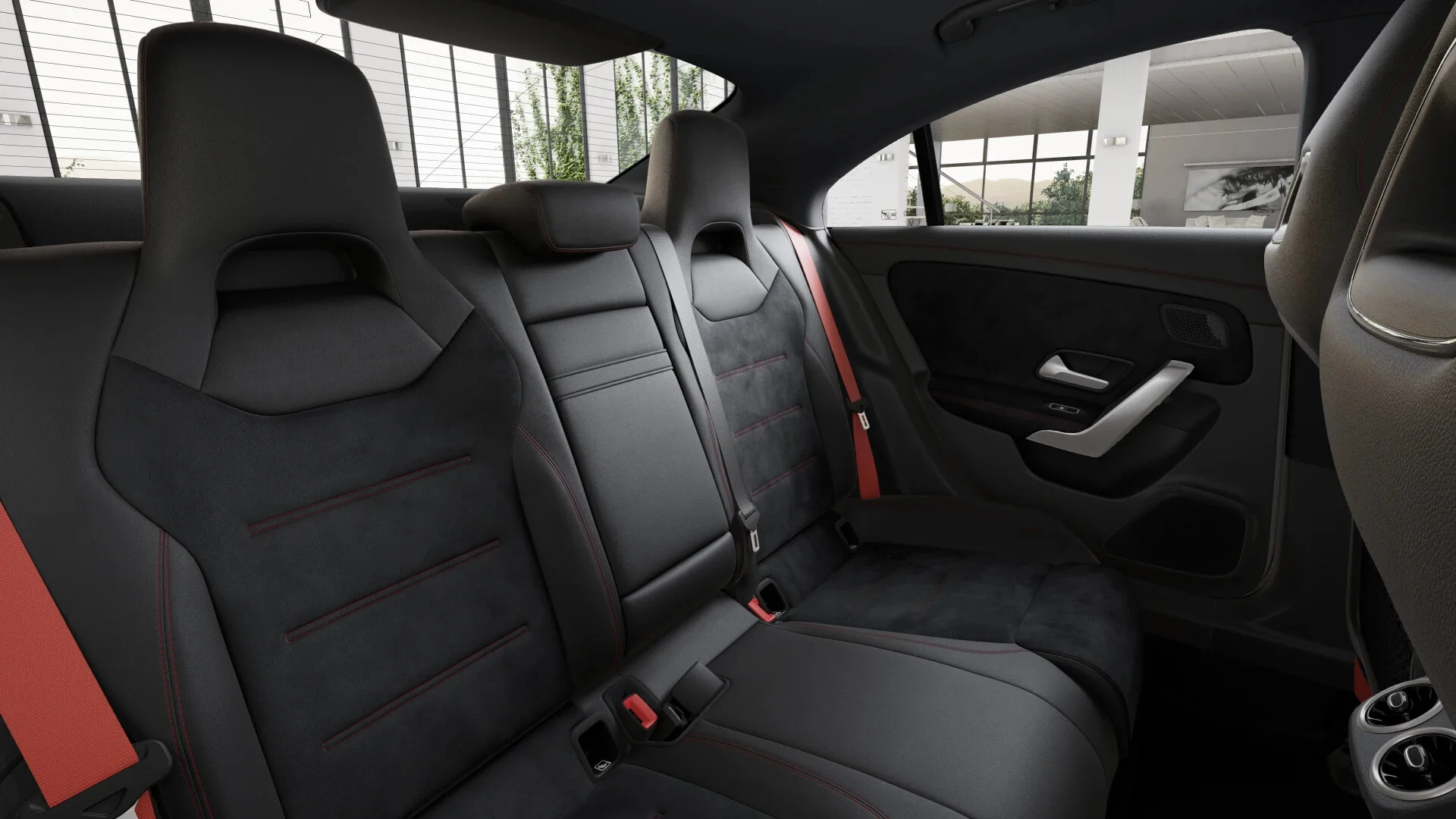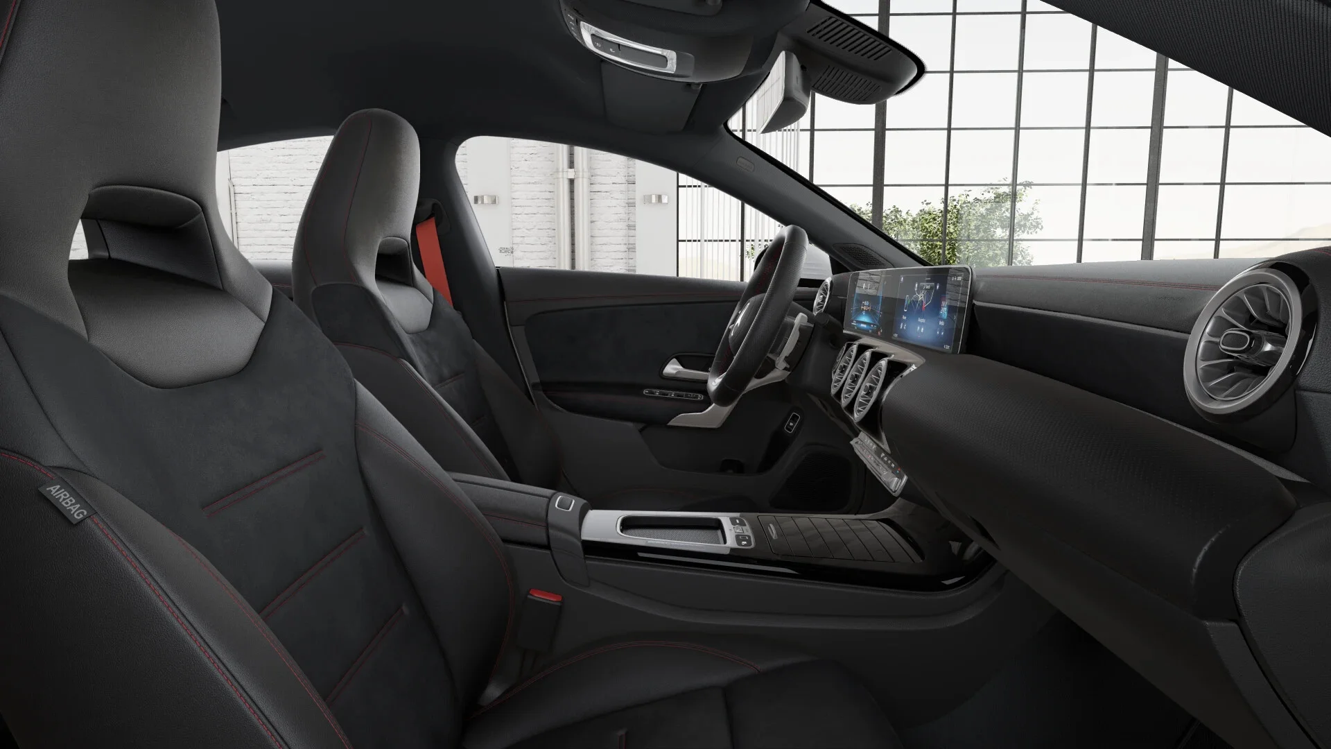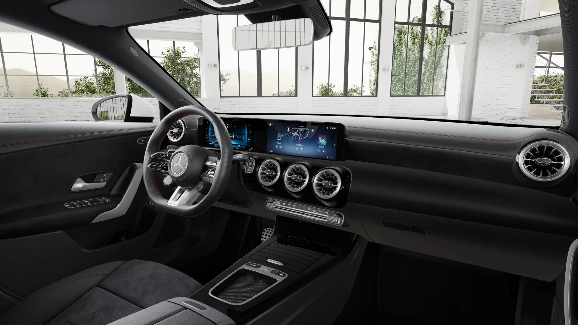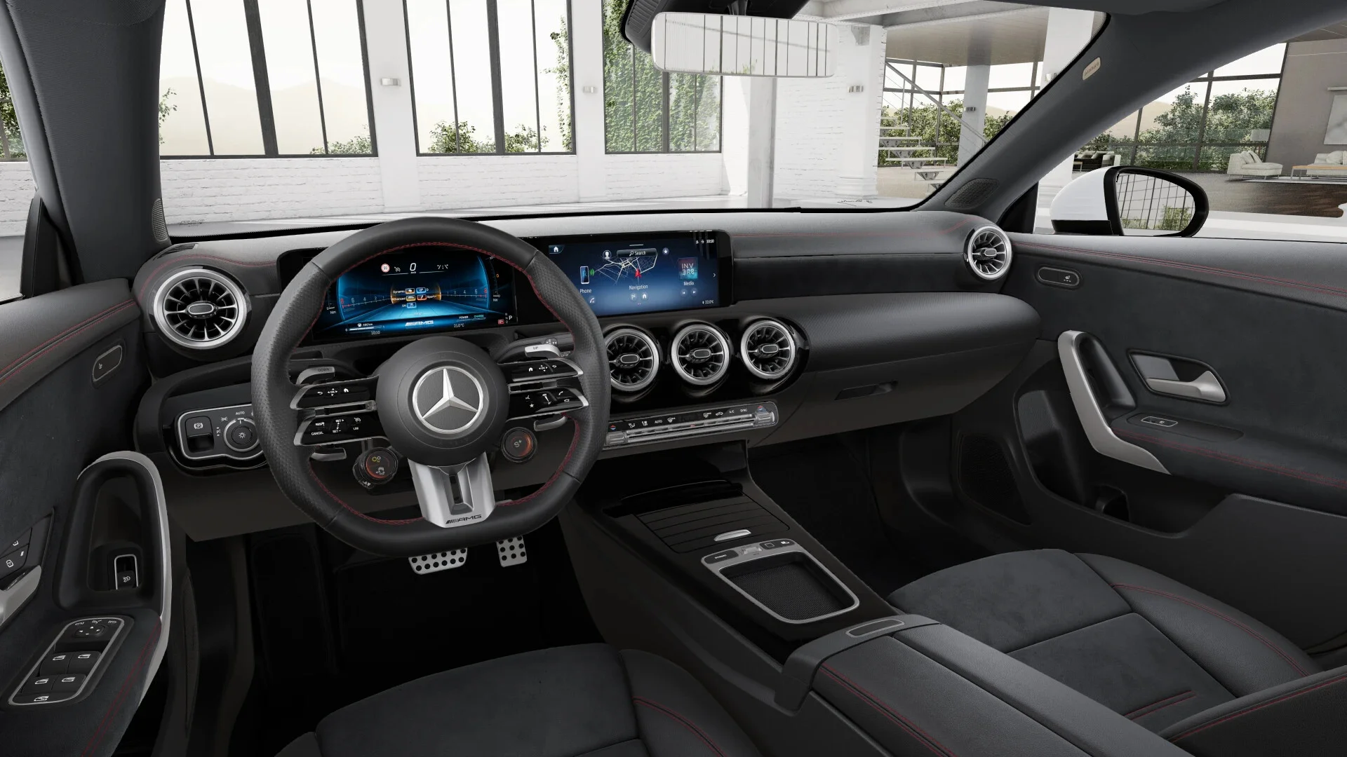 Wnętrze CLA 35 4MATIC Coupé emanuje sportowym duchem AMG. Fotele o sportowym wyprofilowaniu zapewniają doskonałe trzymanie boczne, a tapicerka z mikrofibry DINAMICA i kontrastowymi przeszyciami podkreśla dynamiczny charakter auta. Cyfrowy kokpit MBUX z możliwością personalizacji prezentuje wszystkie istotne informacje w zasięgu wzroku, a sportowa kierownica AMG Performance z łopatkami zmiany biegów daje pełną kontrolę nad autem i potęguje wrażenia z jazdy.