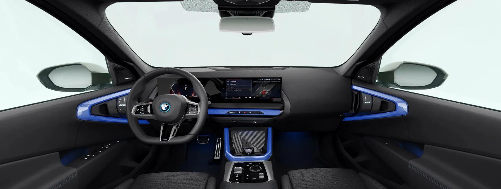 Wnętrze BMW X3 30e to luksusowe połączenie sportowego klimatu i nowoczesnych technologii. Kabina wykończona wysokiej jakości materiałami, takimi jak skóra Vernasca i aluminium, zapewnia komfort i elegancję. Sportowe fotele z regulacją elektryczną i funkcją podgrzewania oferują doskonałe wsparcie podczas dynamicznej jazdy, a skórzana kierownica M oraz aluminiowe pedały dodają wnętrzu sportowego charakteru. Na pokładzie znajduje się 12,3-calowy ekran dotykowy systemu multimedialnego iDrive, obsługujący nawigację, multimedia oraz integrację z Apple CarPlay i Android Auto, co gwarantuje łatwy dostęp do wszystkich funkcji pojazdu.