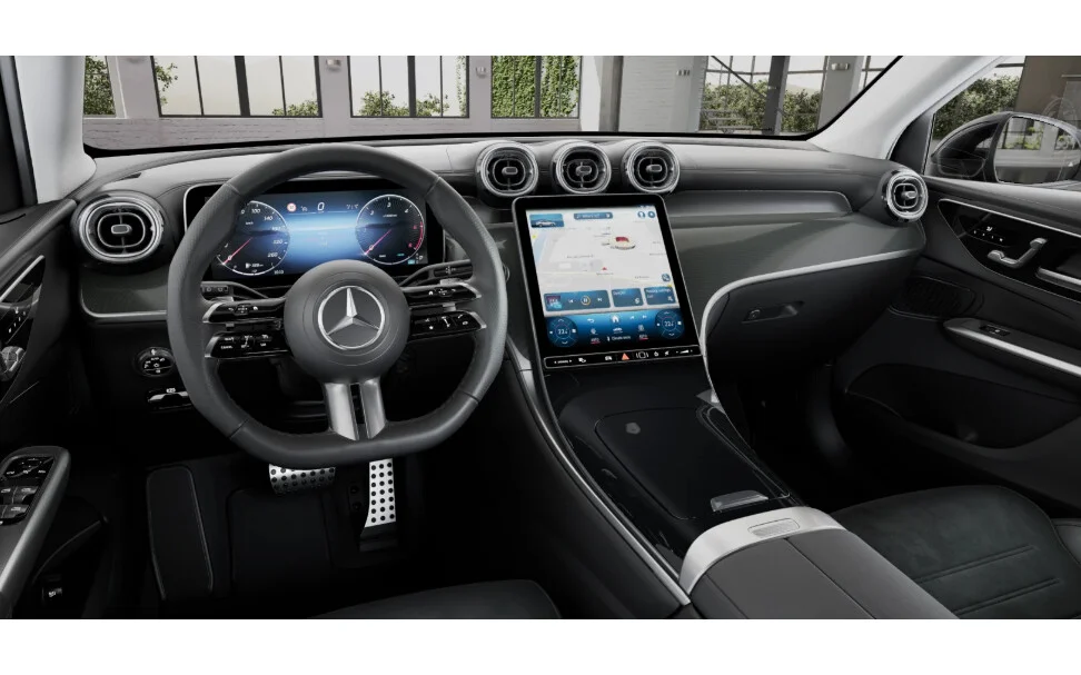 Wnętrze GLC 200d AMG Advanced Plus zostało zaprojektowane z myślą o komforcie i funkcjonalności. Tapicerka z połączenia sztucznej skóry ARTICO i mikrofibry MICROCUT w kolorze czarnym, sportowe fotele oraz sportowa kierownica wykończona skórą nappa tworzą luksusową atmosferę. System multimedialny MBUX z podwójnym ekranem 10,25 cala oferuje intuicyjną obsługę i dostęp do najważniejszych funkcji.