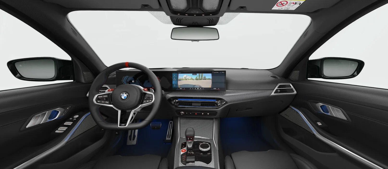 Wnętrze BMW M3 Competition Sedan zostało zaprojektowane z myślą o najwyższym komforcie i sportowym duchu. Kabina oferuje sportowe fotele M Carbon z logotypem M, które zapewniają doskonałe podparcie podczas dynamicznej jazdy, a jednocześnie oferują luksusowy komfort dzięki wykończeniom z wysokiej jakości skóry Merino. Ergonomiczna kierownica M z przyciskami M Drive i łopatkami do zmiany biegów, pozwala na precyzyjne prowadzenie pojazdu. Nowoczesny system multimedialny iDrive z dużym ekranem dotykowym, nawigacją oraz integracją smartfona poprzez Apple CarPlay i Android Auto, zapewnia pełną kontrolę nad funkcjami pojazdu. Cyfrowy kokpit M oferuje personalizowane ustawienia, które pozwalają dostosować wyświetlane informacje do preferencji kierowcy.