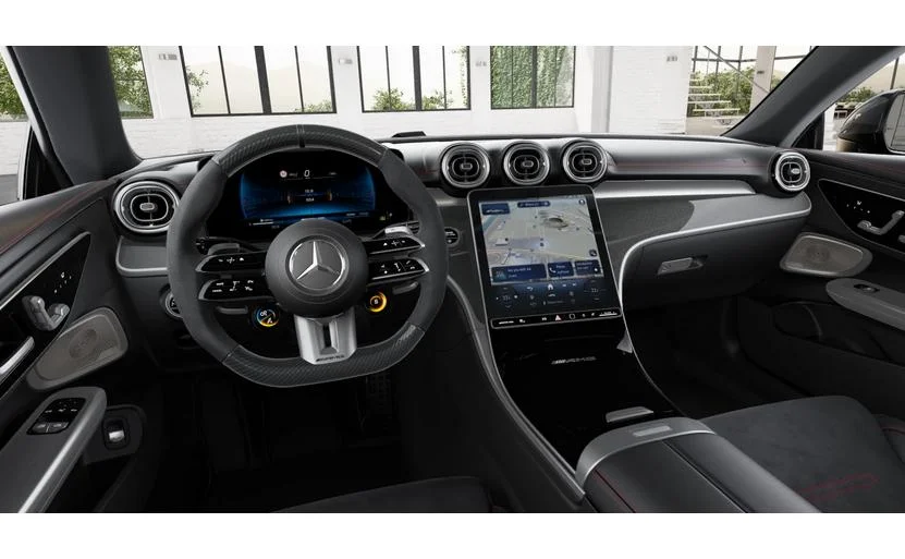 Kabina została zaprojektowana z myślą o kierowcy, który oczekuje sportowych emocji i komfortu. Czerwone pasy bezpieczeństwa, sportowe fotele AMG, podsufitka w kolorze czarnym oraz tapicerka z mikrofibry i skóry sztucznej ARTICO nadają wnętrzu wyjątkowego charakteru. Oświetlenie ambientowe i cyfrowy kokpit Widescreen Cockpit tworzą nowoczesną i dynamiczną atmosferę.