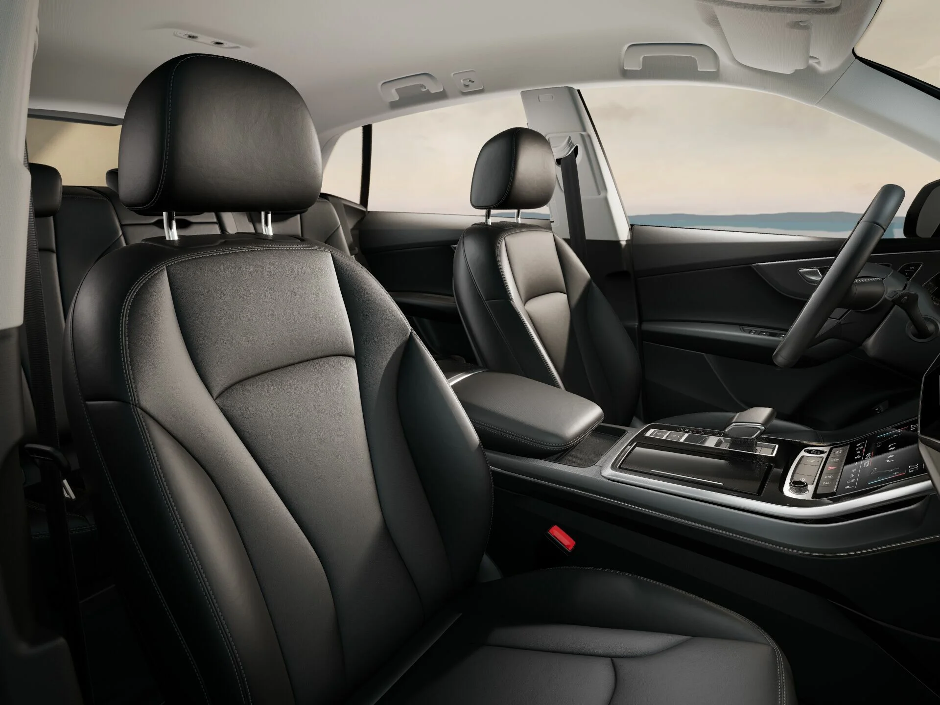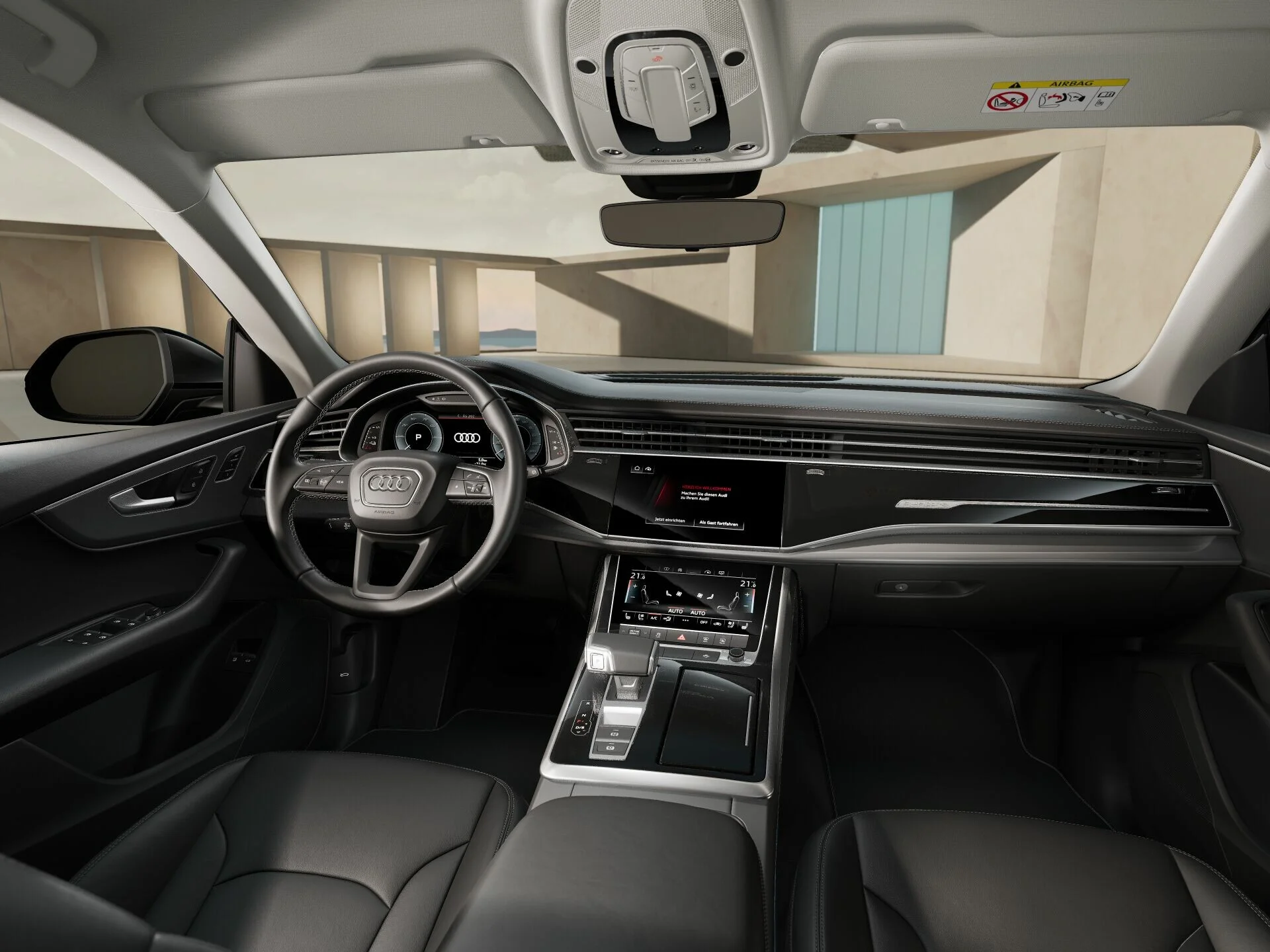 Wnętrze Audi Q8 55 TFSI e quattro oferuje przestrzeń dla pięciu osób, luksusowe materiały wykończeniowe oraz najnowsze technologie. Na pokładzie znajdziesz cyfrowy kokpit Audi Virtual Cockpit Plus, dwa duże ekrany dotykowe systemu MMI, system nagłośnienia Bang & Olufsen (w wyższych wersjach), czterostrefową klimatyzację, podgrzewane i wentylowane fotele oraz ambientowe oświetlenie wnętrza. Systemy bezpieczeństwa i asysty kierowcy, takie jak adaptacyjny tempomat, asystent pasa ruchu, kamera 360° czy system Pre Sense, zapewniają wysoki poziom ochrony i komfortu.