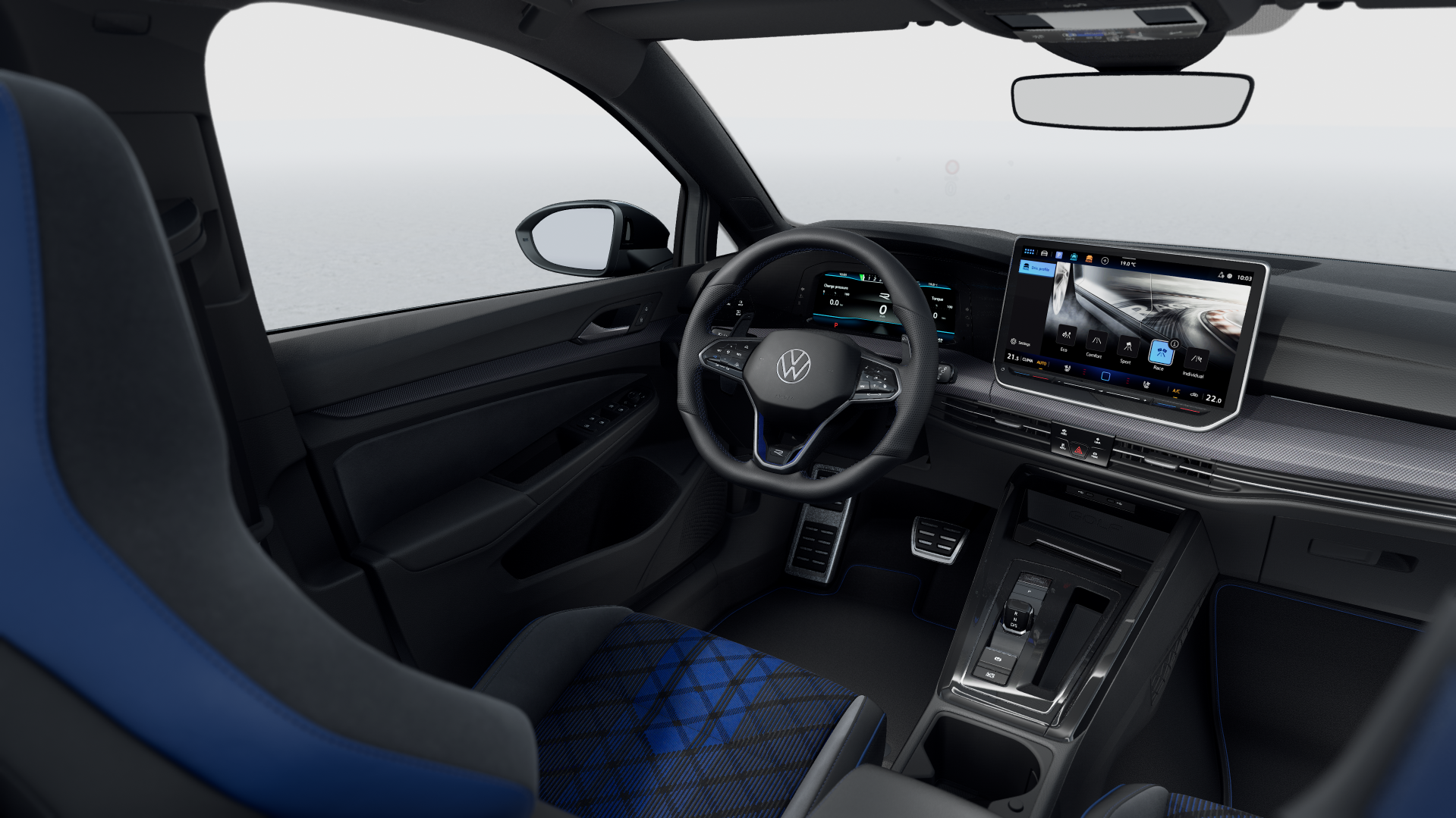 Wnętrze Golfa R to połączenie cyfrowych technologii i sportowego klimatu. Fotele R z logo, niebieskie przeszycia, kierownica z łopatkami i aluminiowe akcenty tworzą atmosferę torowego samochodu. Systemy multimedialne z ekranami wysokiej rozdzielczości oferują wygodny dostęp do ustawień pojazdu, trybów jazdy i rozrywki.