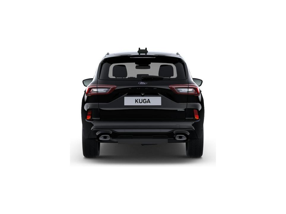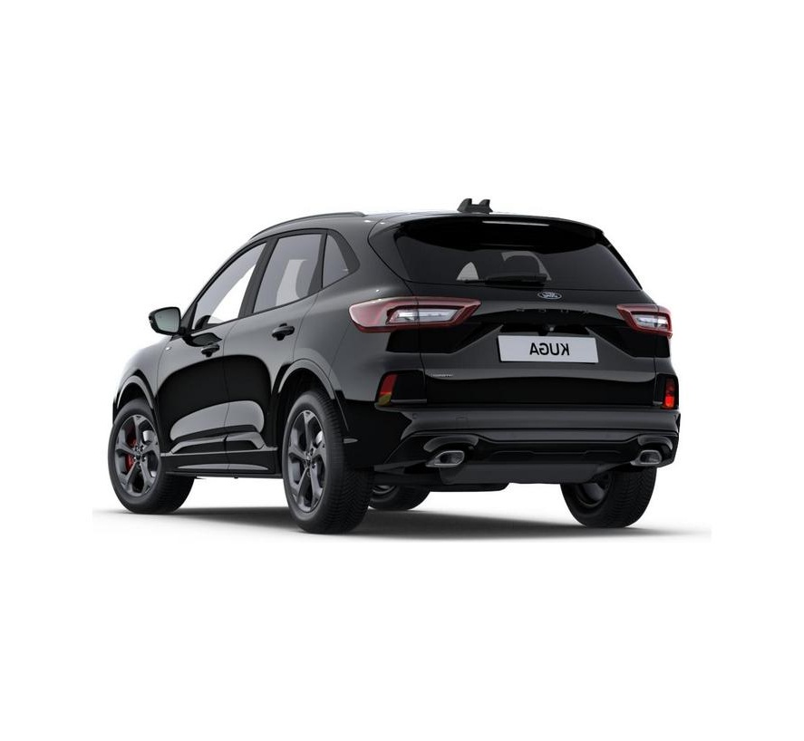 Ford Kuga w wersji ST-Line X wyróżnia się dynamiczną sylwetką i sportowymi detalami. Duży lakierowany spojler, czerwone zaciski hamulcowe i podwójne końcówki wydechu podkreślają jego charakter. Przyciemniane szyby tylne, czarne obramowania szyb i 18‑calowe felgi w kolorze Rock Metallic dopełniają agresywnego wyglądu auta.