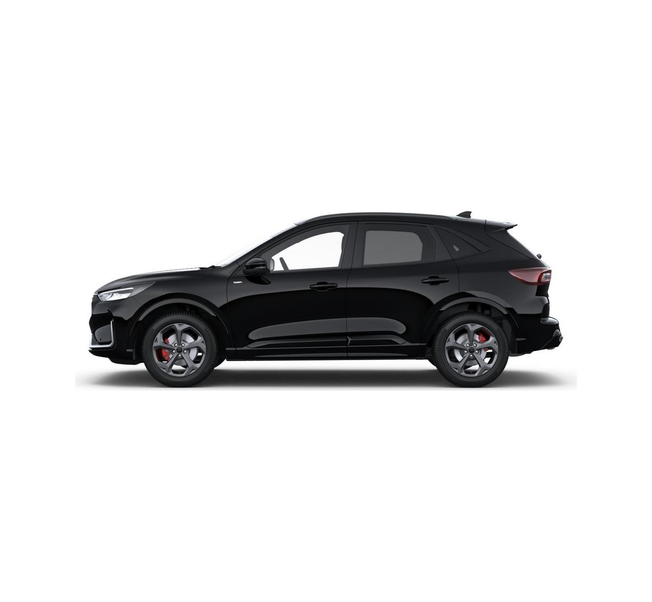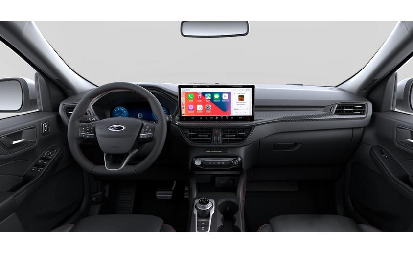 Kabina Kugi ST-Line X łączy sportowy charakter z wysokim komfortem. Podgrzewane fotele z częściową tapicerką skórzaną, przesuwana tylna kanapa z regulacją pochylenia oparć i sportowa kierownica z czerwonymi przeszyciami tworzą przyjemną atmosferę w trakcie jazdy. Konsola centralna z podłokietnikiem, bezprzewodowa ładowarka i praktyczny bagażnik z elektrycznie sterowaną klapą zwiększają codzienną funkcjonalność.