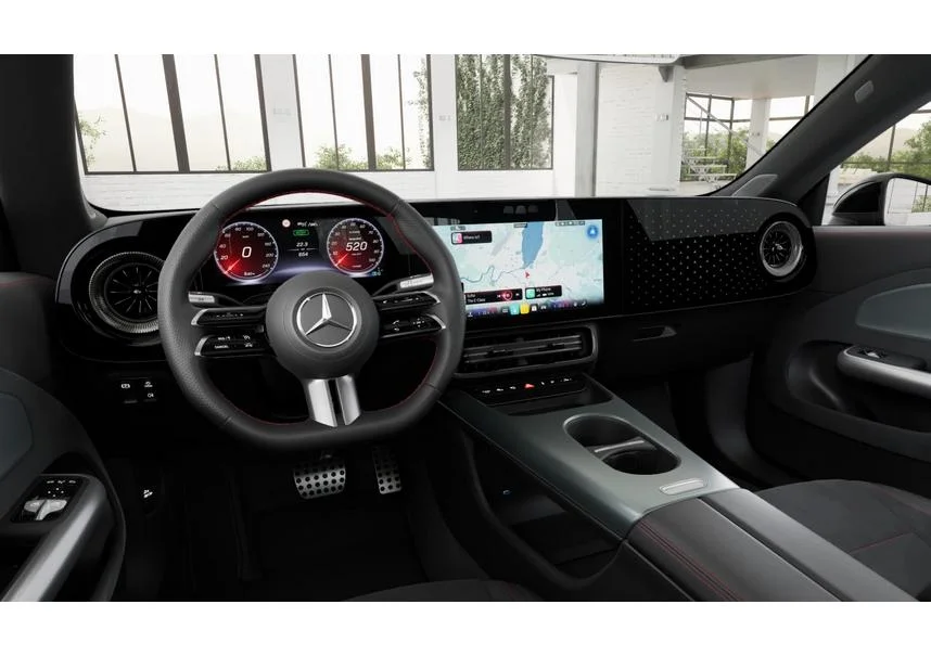 Wnętrze CLA 250+ EQ to połączenie nowoczesnych technologii z elegancją. Podgrzewane sportowe fotele, klimatyzacja automatyczna THERMATIC i ambientowe oświetlenie tworzą przyjemną atmosferę. Multimedialny system MBUX z cyfrowym kokpitem i obsługą głosową ułatwia codzienną jazdę, a wykończenia AMG dodają sportowego charakteru.
