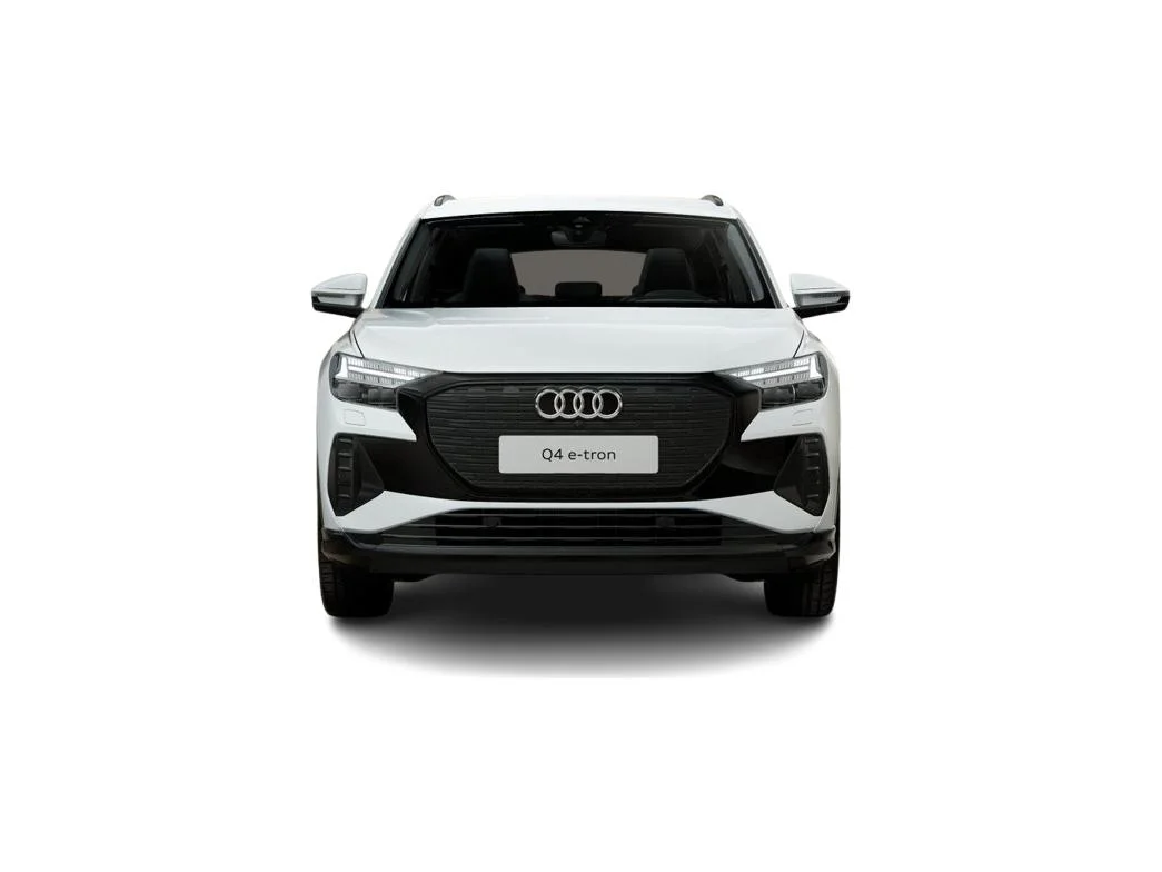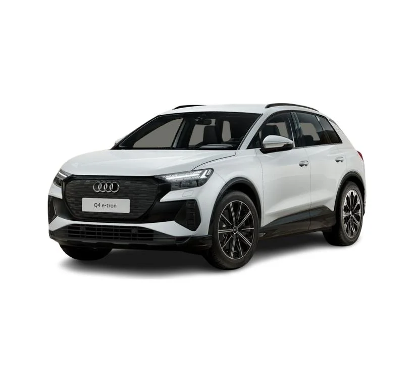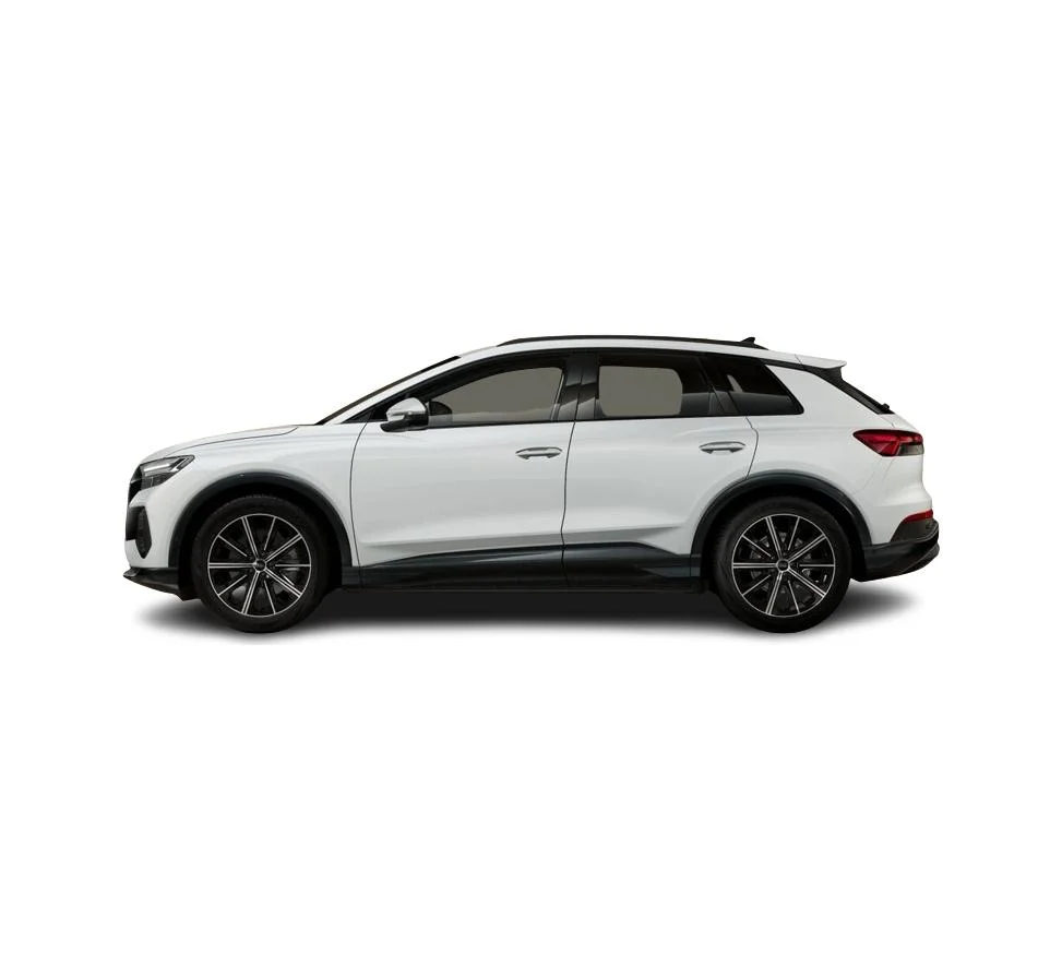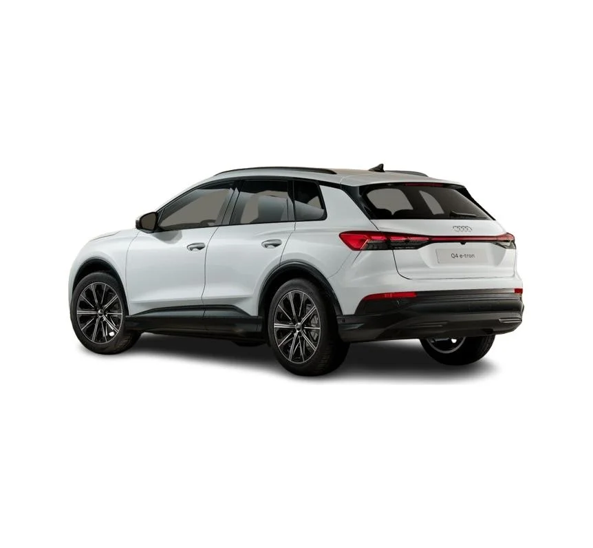 Audi Q4 e-tron 45 to kompaktowy SUV elektryczny, który łączy minimalistyczną elegancję z muskularną sylwetką. Wersja z lakierem Glacier White metalik i pakietem optycznym Czerń prezentuje się wyjątkowo dynamicznie. Smukłe reflektory Matrix LED z animacją świetlną, 20-calowe felgi Audi Sport Stern Aero oraz podświetlany pas tylnych lamp nadają mu nowoczesny, prestiżowy wygląd. To samochód, który przyciąga wzrok i jednocześnie emanuje typową dla Audi solidnością i harmonią proporcji.