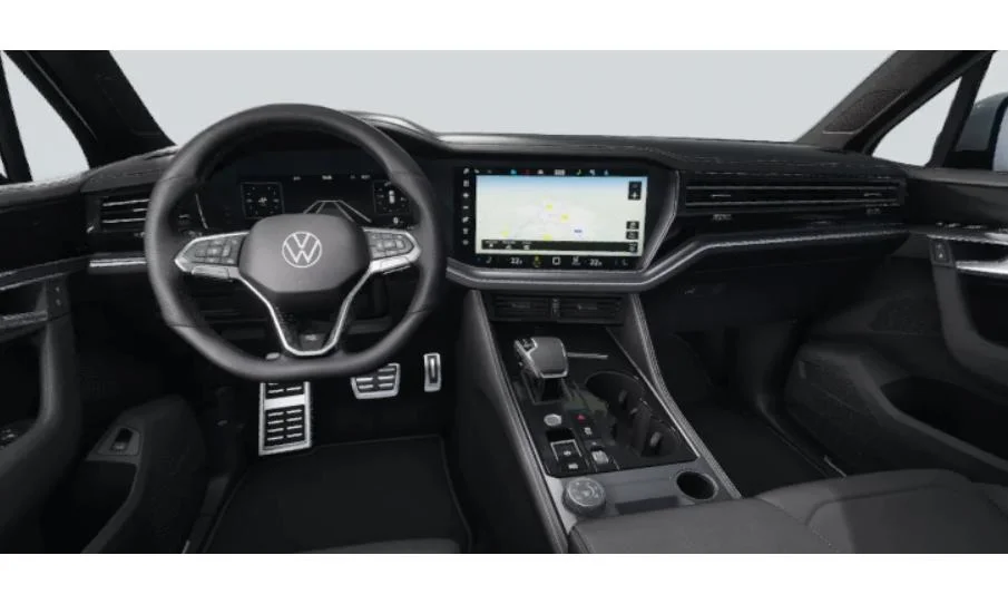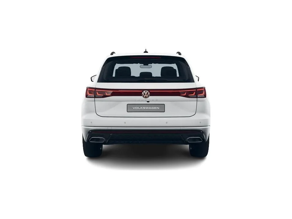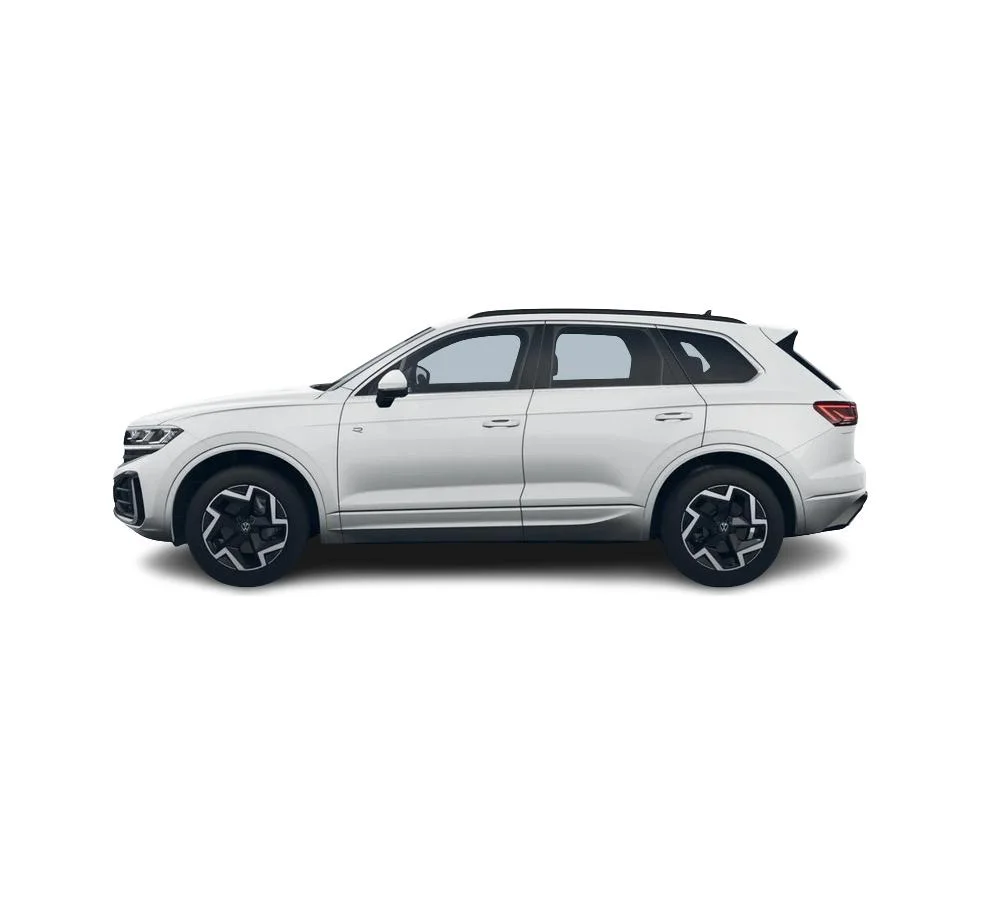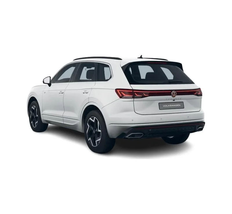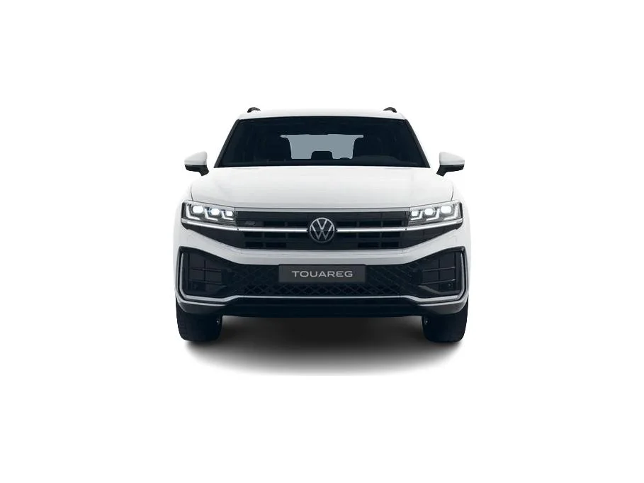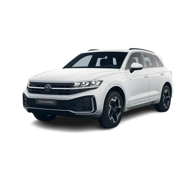 Touareg w wersji R‑Line łączy elegancję z dynamicznymi akcentami. Biały lakier Pure (specjalny), czarne relingi, listwy progowe ze stali szlachetnej z logo R‑Line oraz 19-calowe felgi aluminiowe Coventry podkreślają charakter auta. Reflektory LED Matrix ze statycznym doświetlaniem zakrętów i tylne światła LED z dynamicznymi kierunkowskazami dopełniają nowoczesnego wyglądu.