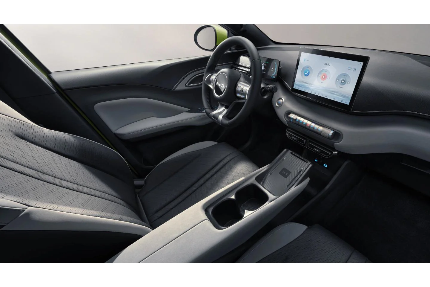 Wnętrze BYD Dolphin to przestrzeń łącząca nowoczesność i funkcjonalność. Na środku dominuje obrotowy ekran dotykowy 12,8”, obsługujący multimedia i nawigację. Ergonomiczne fotele, wielofunkcyjna kierownica oraz przemyślane schowki sprawiają, że wnętrze jest wygodne i praktyczne. Dzięki szerokiemu rozstawowi osi i płaskiej podłodze pasażerowie mają dużo miejsca, a bagażnik o pojemności 345 litrów (do 1310 l po złożeniu siedzeń) sprawdzi się w codziennym użytkowaniu.