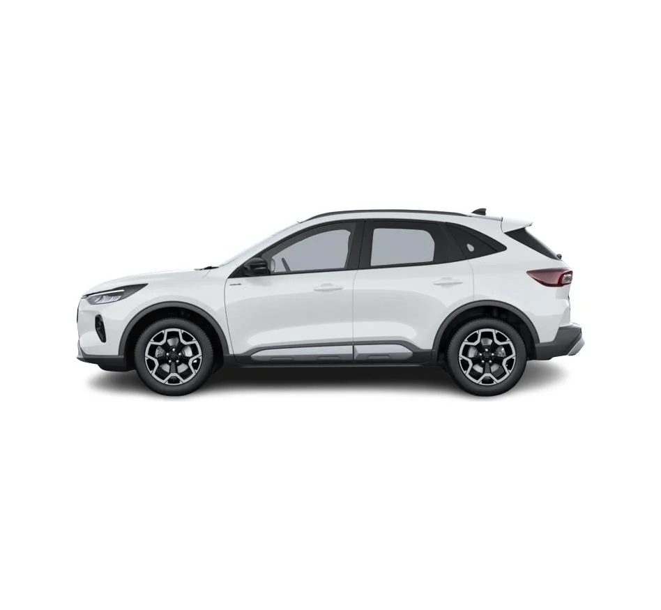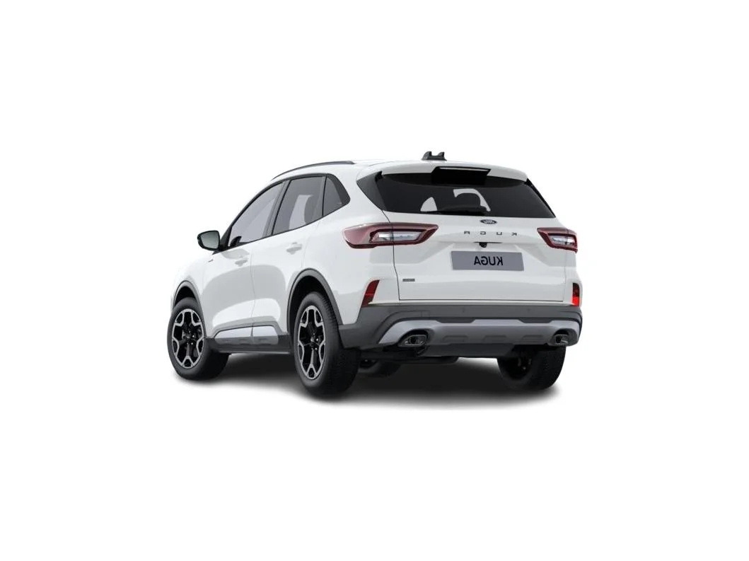 Nowa Kuga 2.5 PHEV w wersji Active to połączenie solidnego, terenowego wyglądu z nowoczesną technologią. Sylwetka auta jest muskularna, z wyraźnie zarysowanymi błotnikami i sportowymi akcentami, takimi jak podwójne końcówki wydechu czy relingi dachowe w czarnym wykończeniu. Praktyczne elementy, jak podwyższone zawieszenie i duży prześwit (200 mm), czynią z niej idealnego towarzysza zarówno w mieście, jak i poza asfaltem.