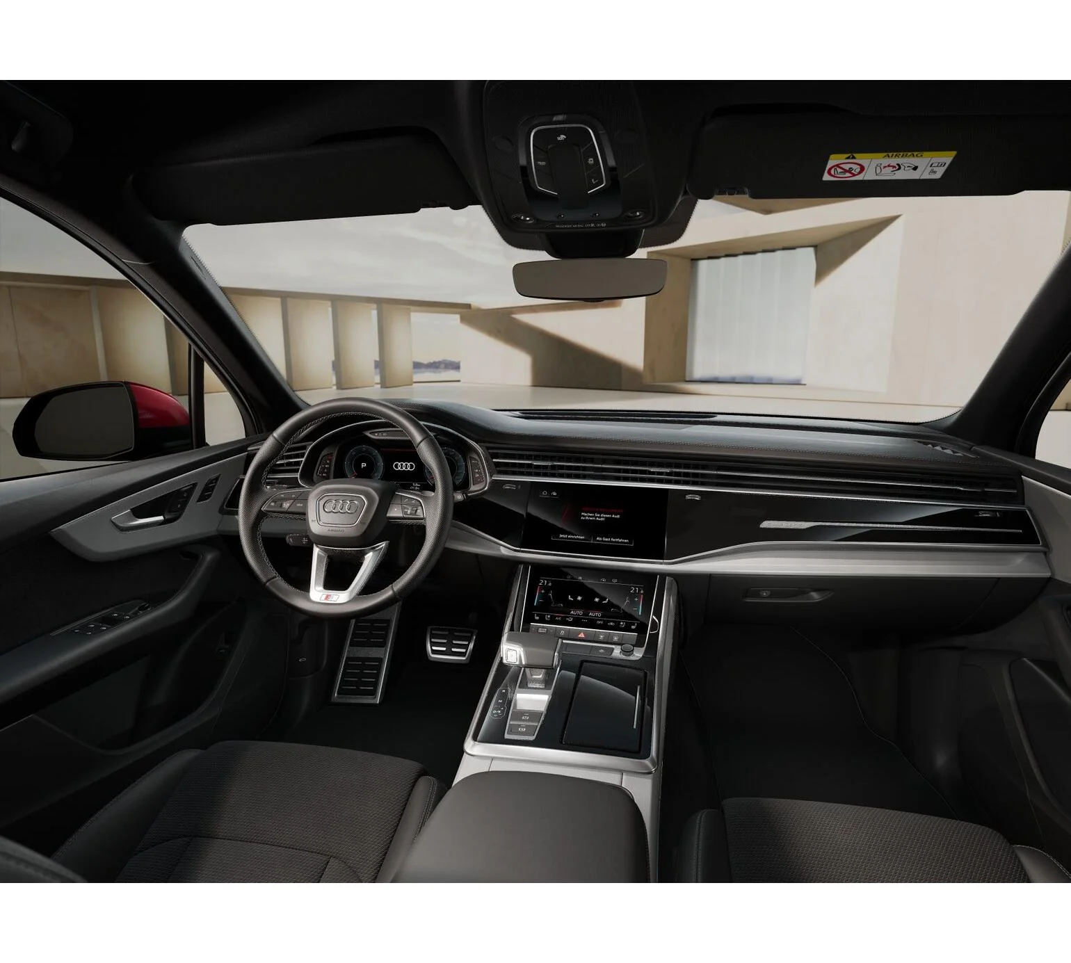 Kokpit w wersji S line oferuje połączenie sportowej estetyki i wysokiej jakości materiałów. Mikrofibra Dinamica Frequenz połączona ze skórą z logo S tworzy elegancką i dopracowaną przestrzeń, w której każdy detal ma znaczenie. Fotele sportowe dają solidne podparcie, a czarna podsufitka i dekor aluminiowy budują nowoczesną atmosferę. Duża przestrzeń dla pasażerów oraz wysoki poziom wyciszenia czynią z Q7 idealny samochód do długich podróży i codziennego użytkowania.