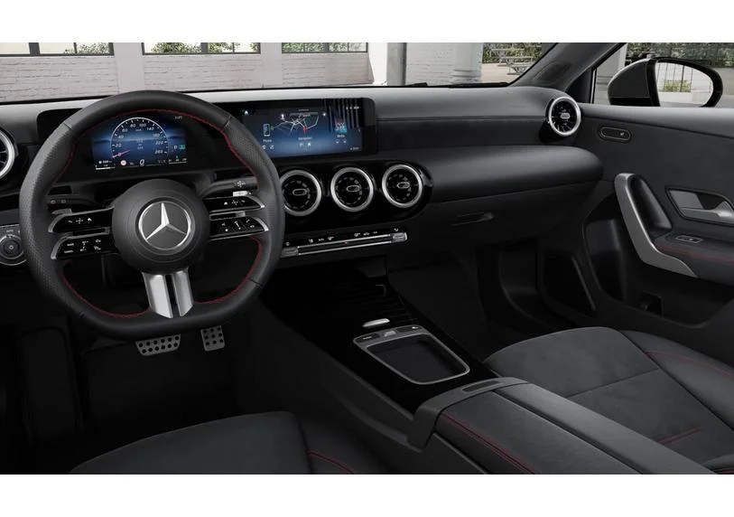 Kabina A 200 została zaprojektowana z naciskiem na ergonomię i wygodę codziennej jazdy. Wysokiej jakości materiały, sportowe akcenty, podgrzewane fotele oraz czarna podsufitka tworzą przyjemną, dopracowaną przestrzeń. System MBUX z dużym ekranem 10,25” zapewnia szybki dostęp do ustawień auta, nawigacji i multimediów. Schowki, siatki w oparciach i rozsądnie zaprojektowana konsola centralna zwiększają praktyczność w codziennym użytkowaniu.