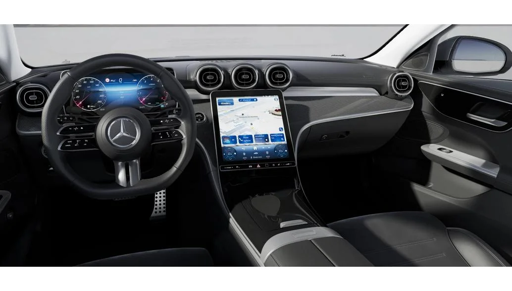 Kabina C 300 Kombi jest nowoczesna, przestronna i wykonana z dbałością o detale. Pionowy ekran systemu MBUX, cyfrowe zegary oraz ambientowe oświetlenie tworzą futurystyczne, bardzo komfortowe środowisko. Sportowe elementy AMG — jak kierownica nappa czy tapicerka ARTICO/MICROCUT — dodają wnętrzu dynamicznego sznytu. To przestrzeń zarówno do pracy za kierownicą, jak i do rodzinnych podróży.